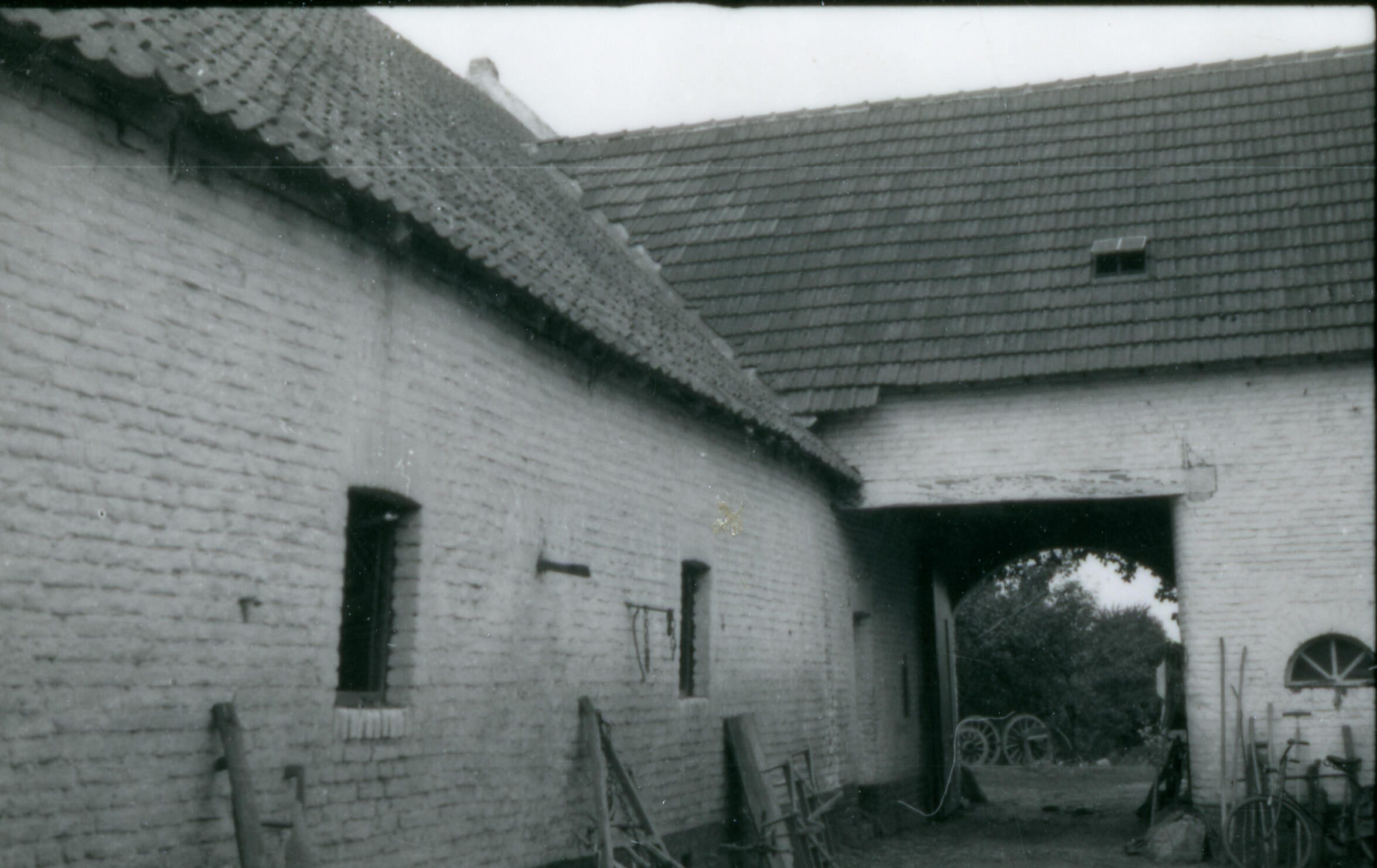 Binnenplaats van een vierkantshoeve, Maasbracht, 1940 (zwart-wit foto)