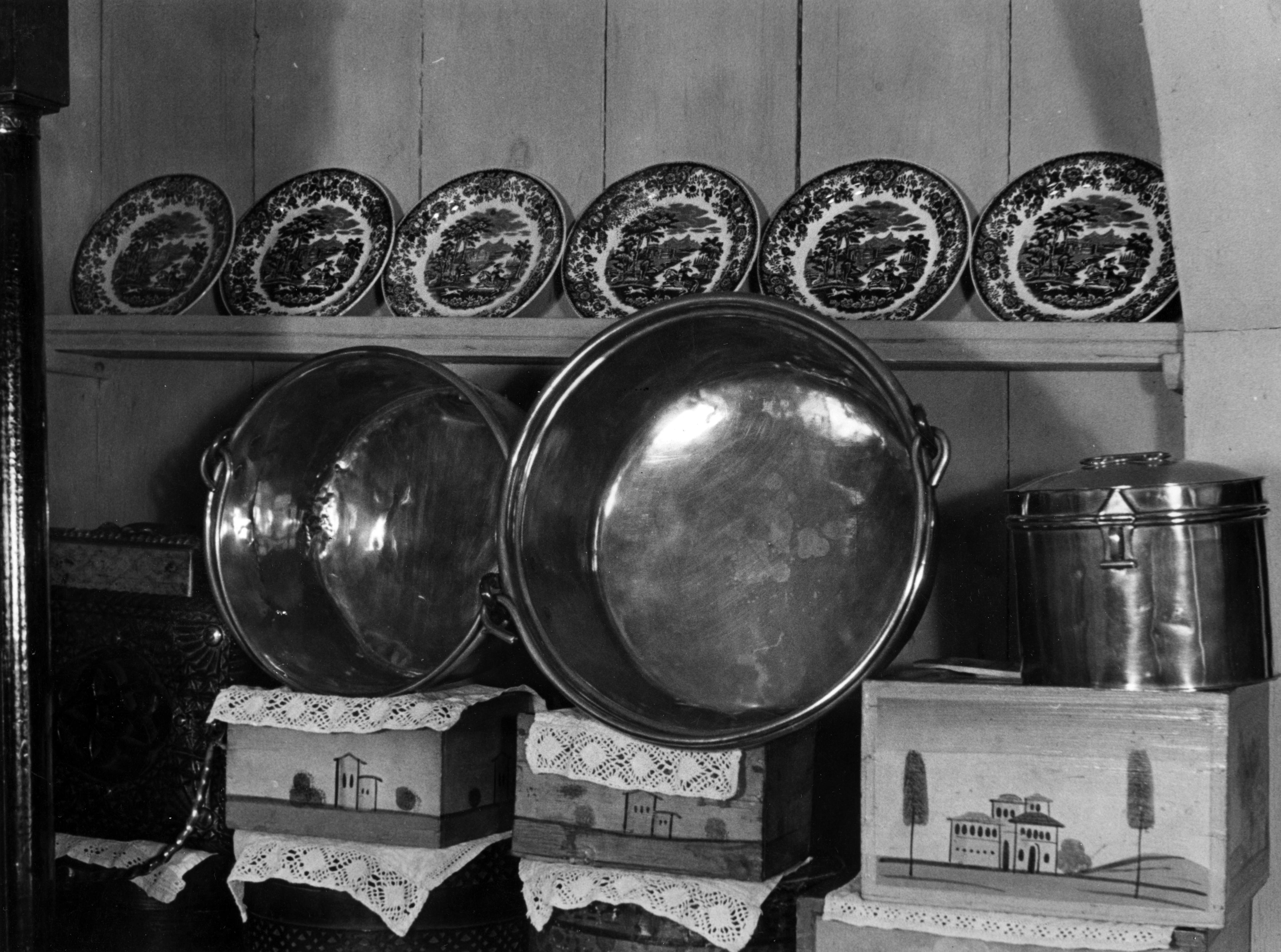 Pannen, wandborden en kistjes, Marken, 1943 (zwart-wit foto)