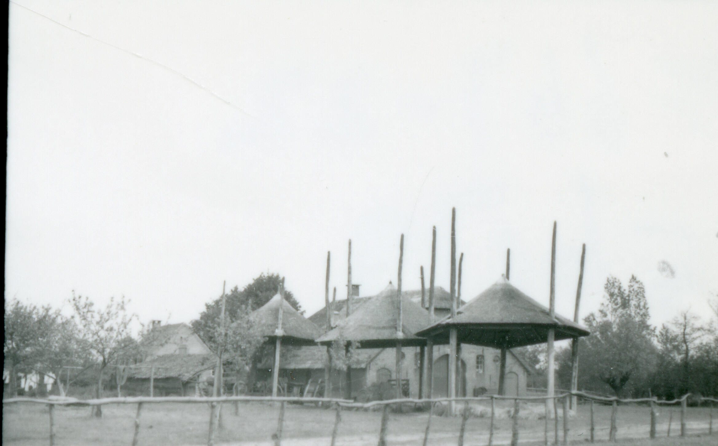 Boerderij met hooibergen, Hoogland, 1942 (zwart-wit foto)