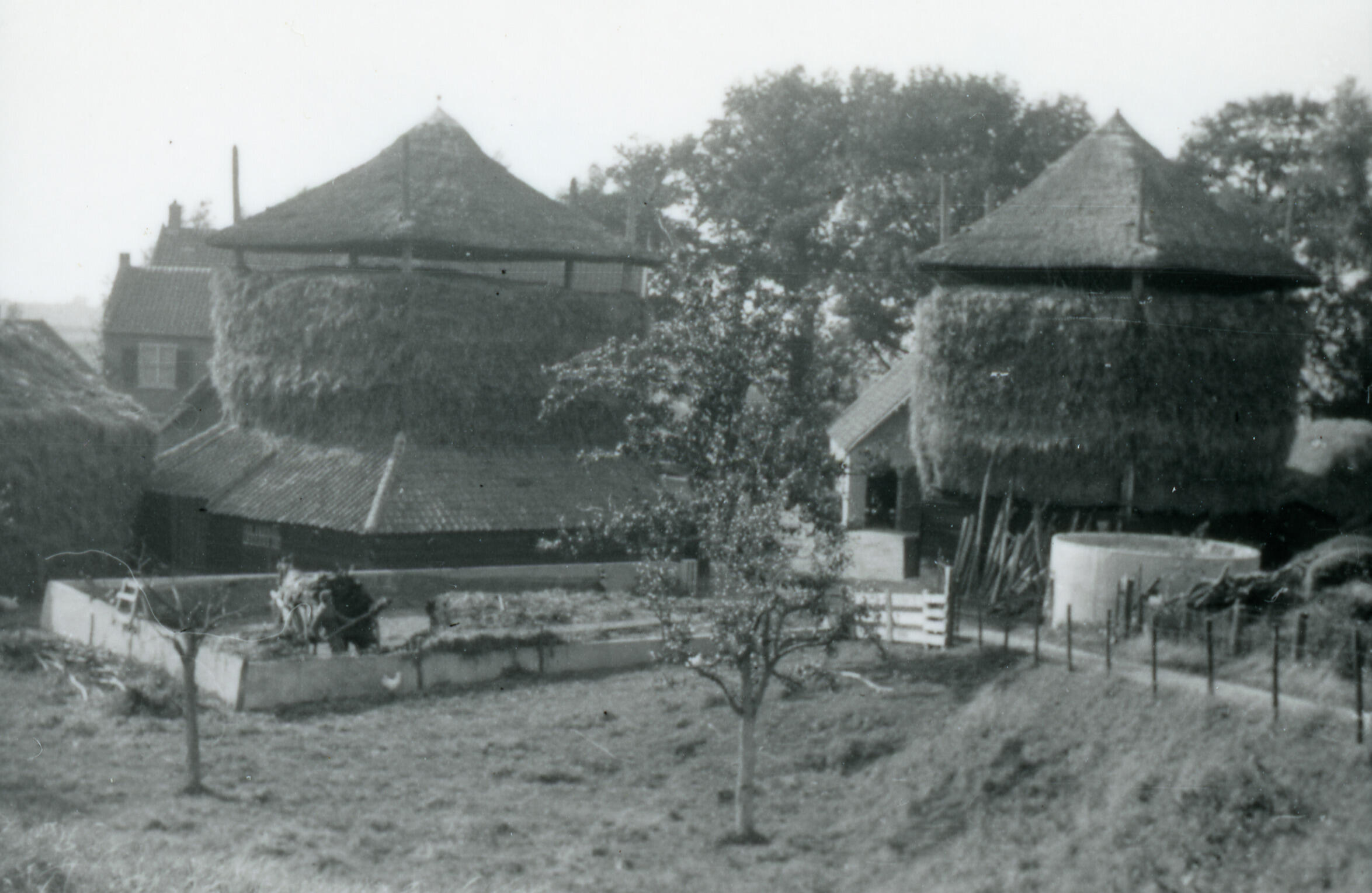 Hooibergen bij een boerderij, Ophemert, 1943 (zwart-wit foto)
