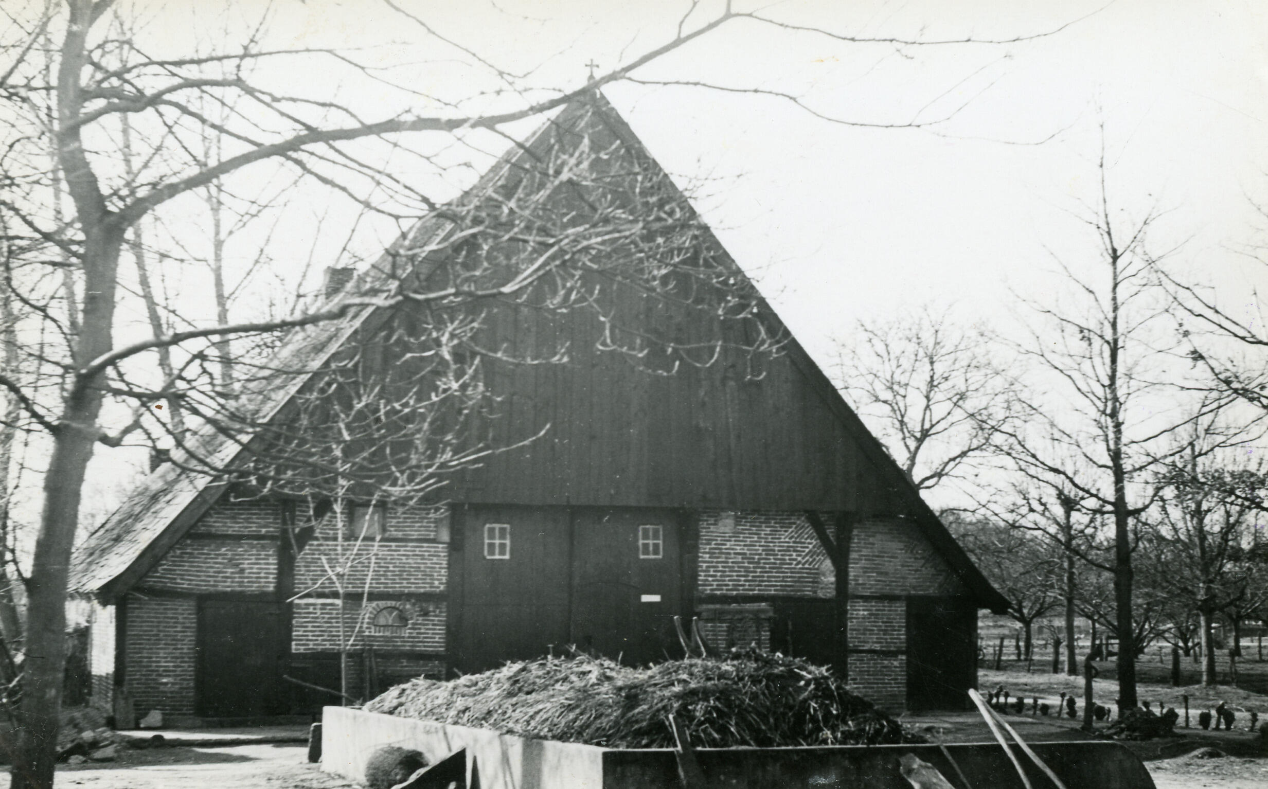 Achtergevel van een hallenhuisboerderij in het Overijsselse Beuningen. De gevels bestaan uit vakwerkbouw, gevuld met bakstenen. De achtergevel heeft een houten topgevel en op het dak een gevelteken in de vorm van een klein kruis. Achter de boerderij ligt een mestvaalt.