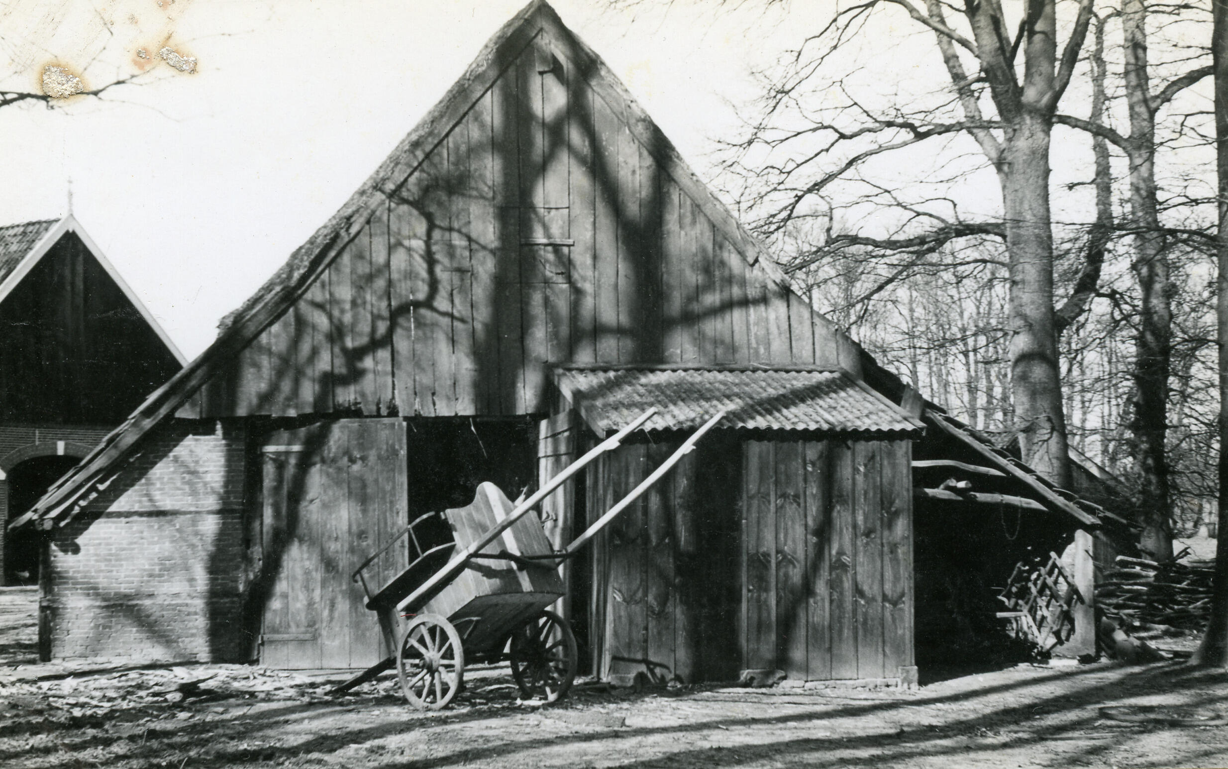 Een bijschuur met daarvoor een dresseerkar in het Overijsselse Beuningen. In de schuur ligt een eg.