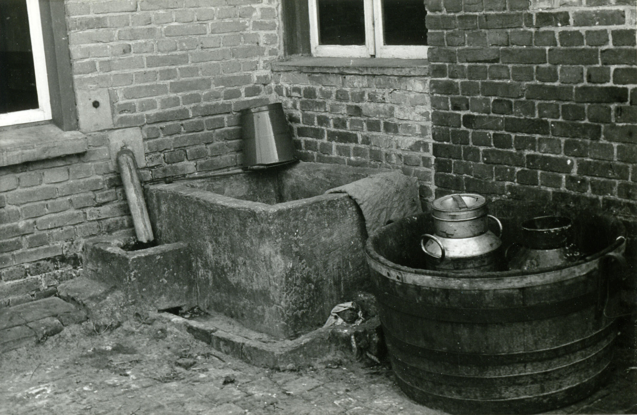Koelbak met een emmer en een houten tobbe met melkbussen voor het koelen van melk bij een boerderij in het Brabantse Deurne.