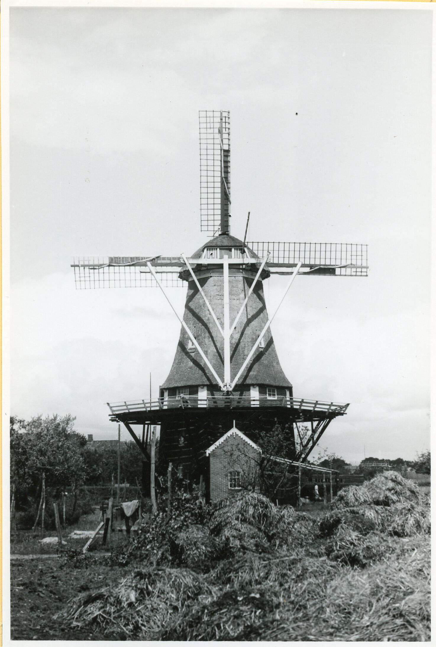 Een stellingmolen aan de Tramstraat 22 in het Drentse Schoonoord, met als functie het malen van graan. Op de voorgrond ligt een berg hooi of mest.