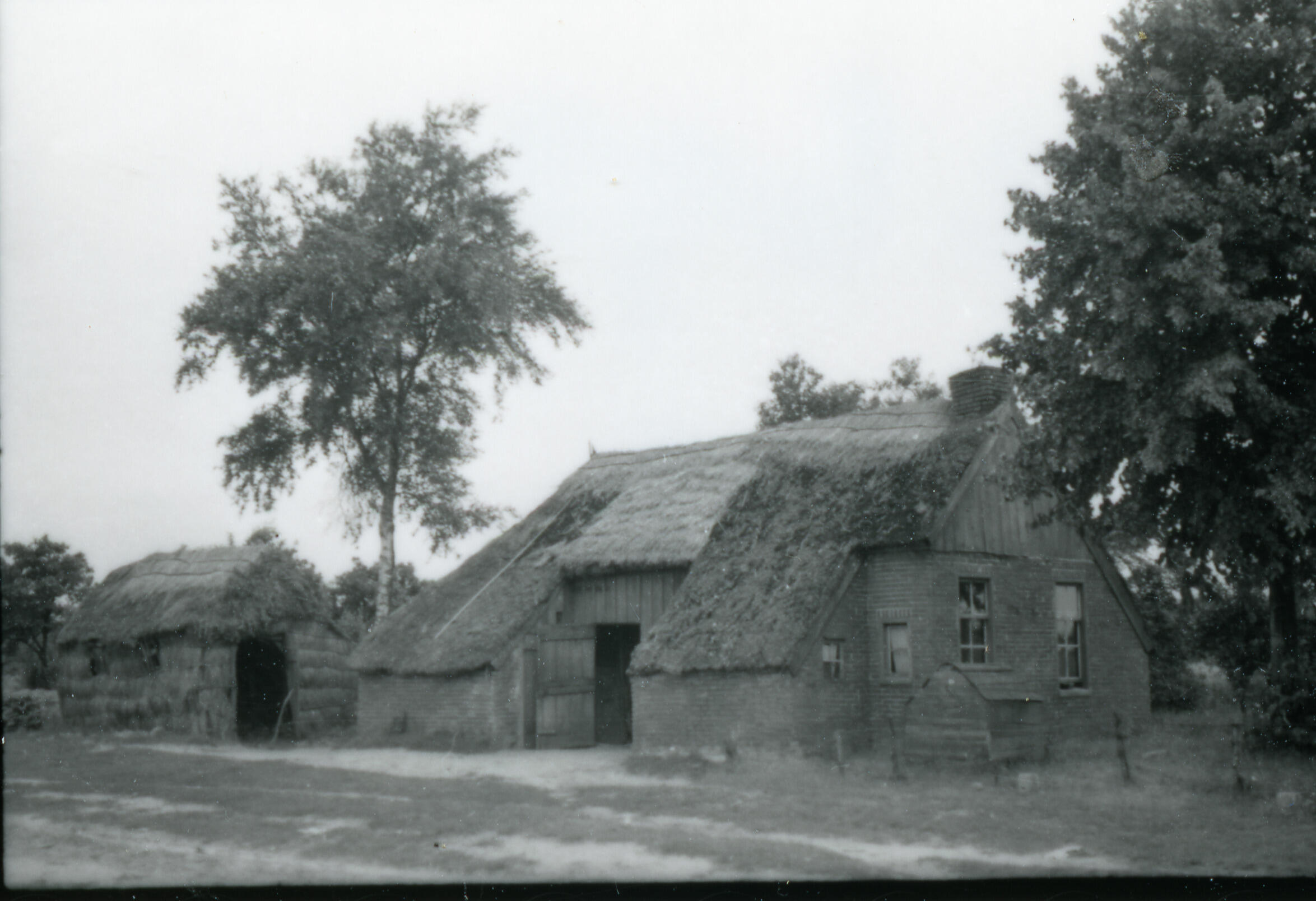 Een boerderij met een zijbaander in het Drentse Ees, met links een schuurtje met strowanden.