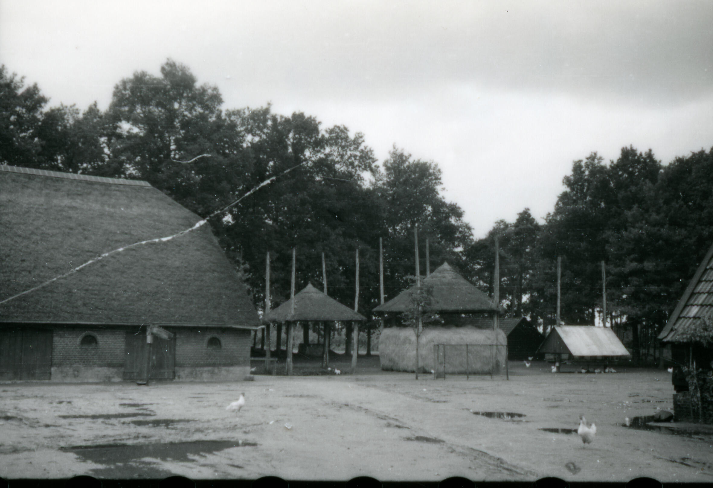 Hooibergen op een erf, Ederveen, 1939 (zwart-wit foto)