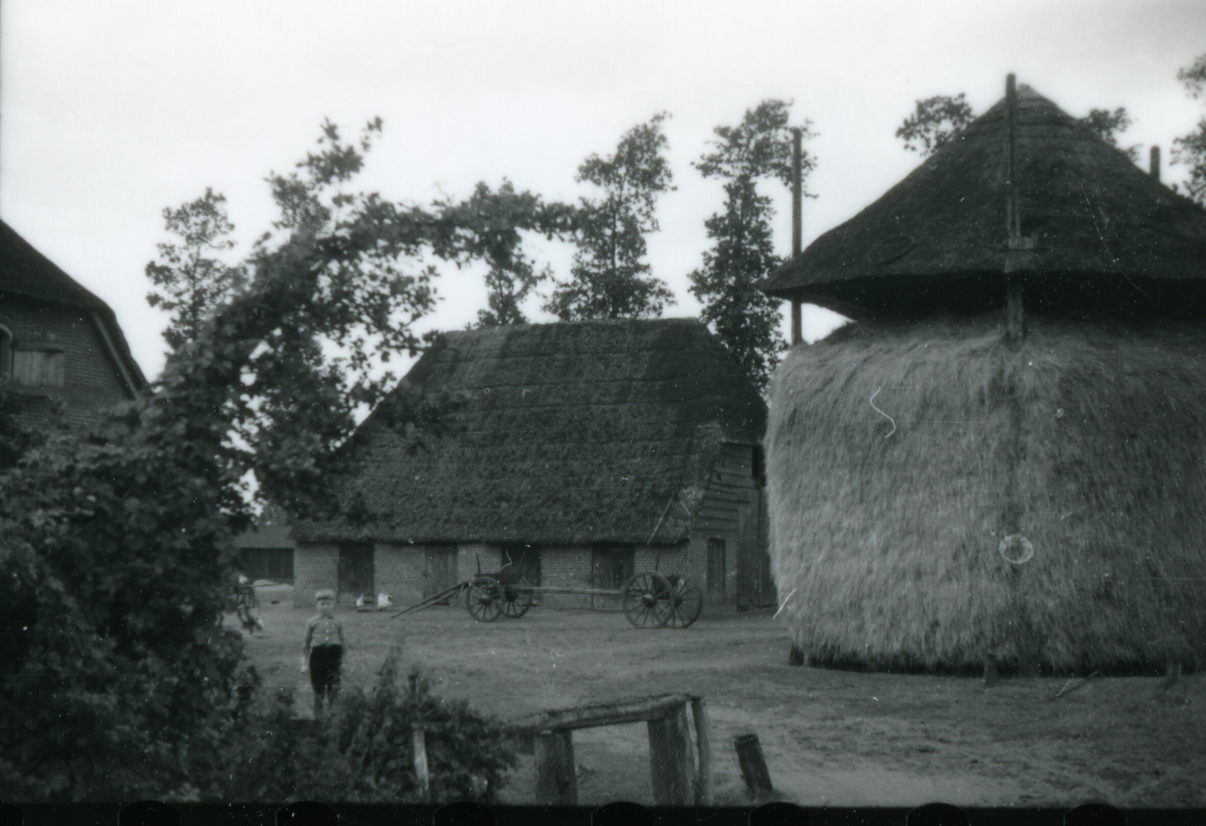 Een vrijstaande bijschuur en een hooiberg naast een boerderij in het Gelderse Ederveen. Op het erf staat een boerenwagen.