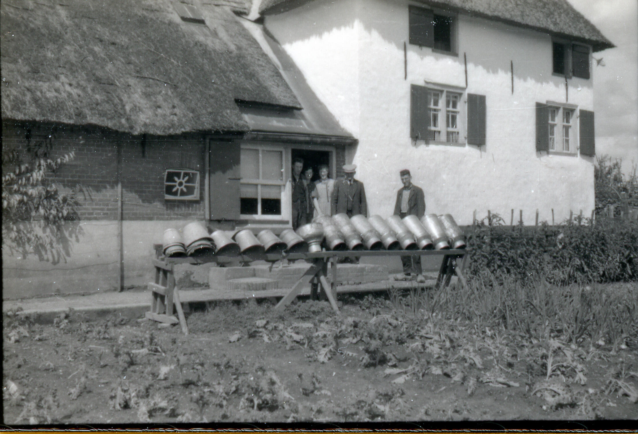 Emmer- en melkbussenrek naast een T-boerderij in het Gelderse Ewijk. Voor en in de deuropening staan mensen.