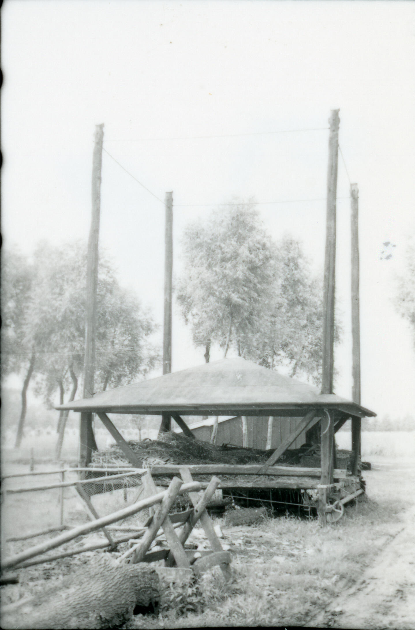 Een hooiberg met een in hoogte verstelbaar dak op vier roeden in Winterswijk, in de Achterhoek.