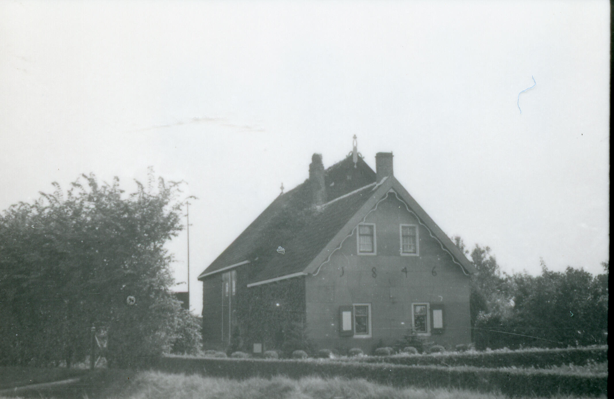 Zij- en voorgevel van een boerderij in het Zeeuwse Koudekerke, met links het bedrijfsgedeelte en rechts het woongedeelte. Muurankers aan de gevel vormen het jaartal 1846. Aan het dak zit een versierde windveer.