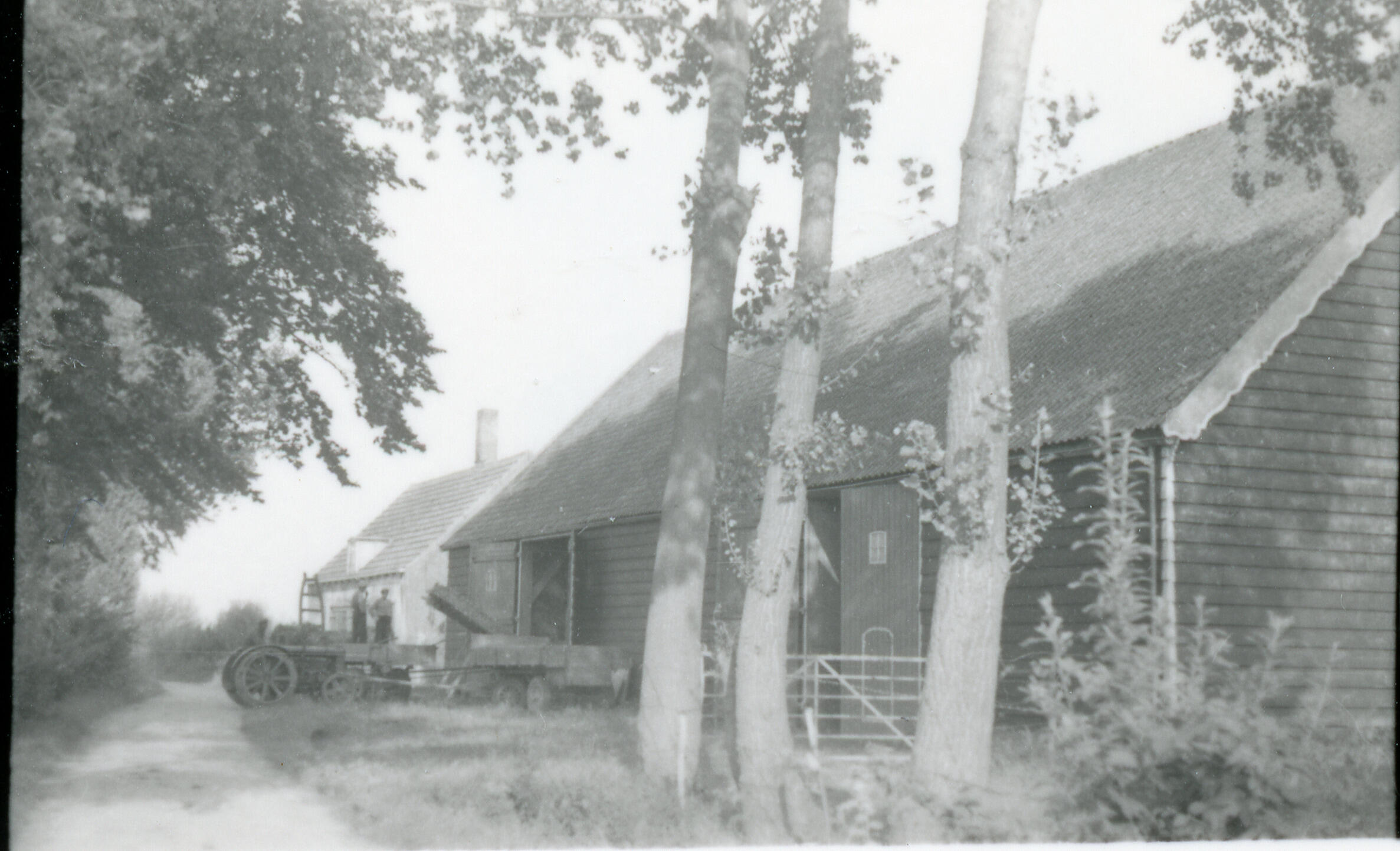Boerderij in het Zeeuwse Oost-Souburg, met links het woonhuis en rechts de schuur. Voor de boerderij staat een tractor.