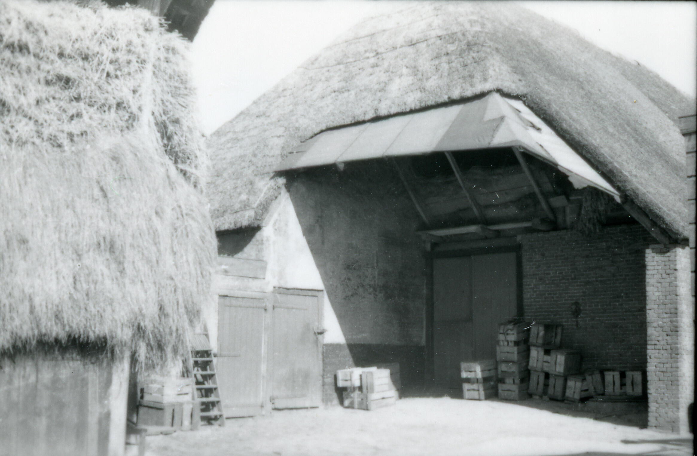 Achtergevel van een boerderij met een overstek in het Gelderse Gellicum. Onder de overstek liggen houten kratten.