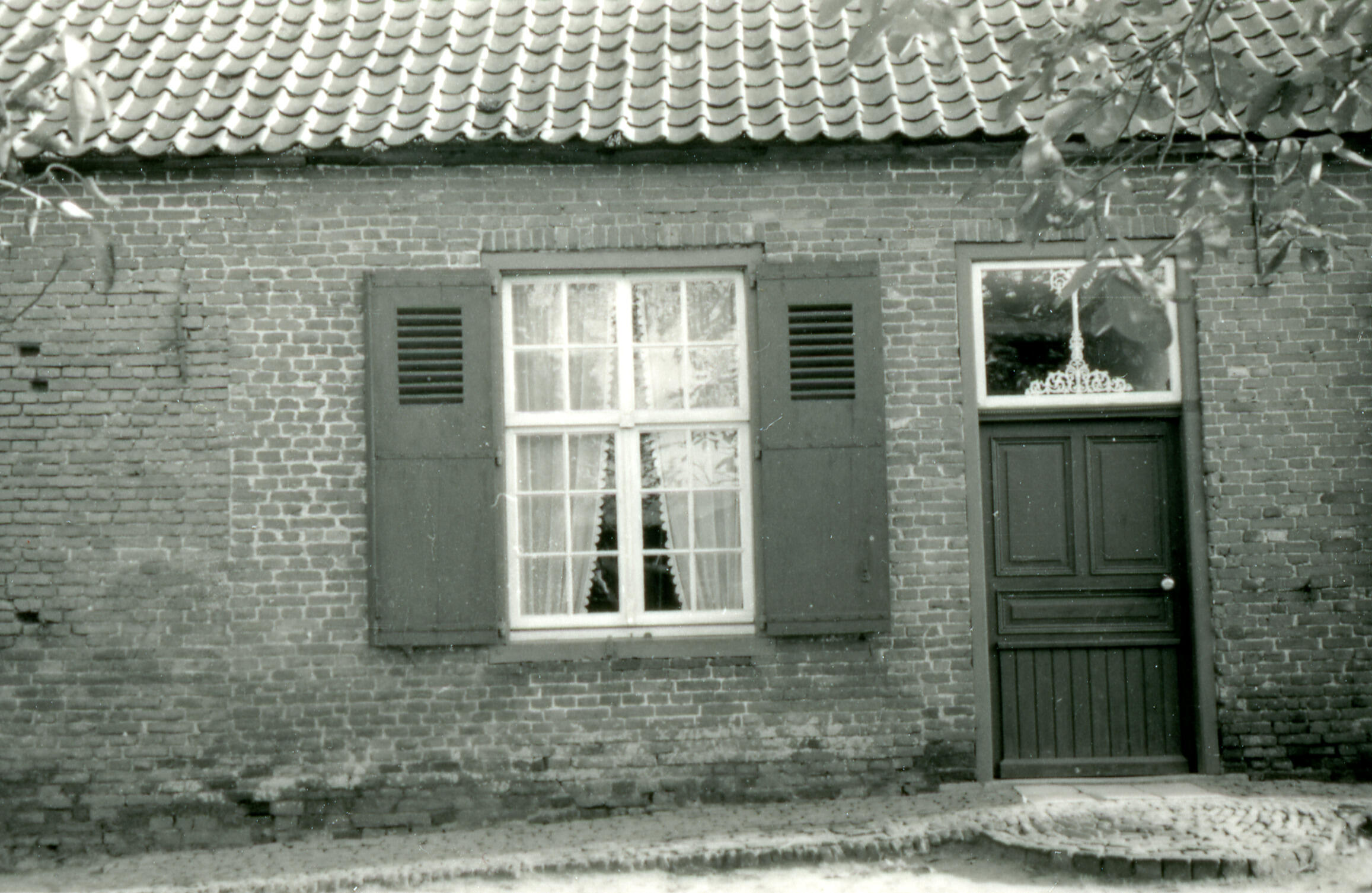 Deel van de voorgevel van een boerderij in het Brabantse Maarheze. In de gevel zit een raam met roedenverdeling en houten luiken, en een voordeur met een levensboom in het bovenlicht.