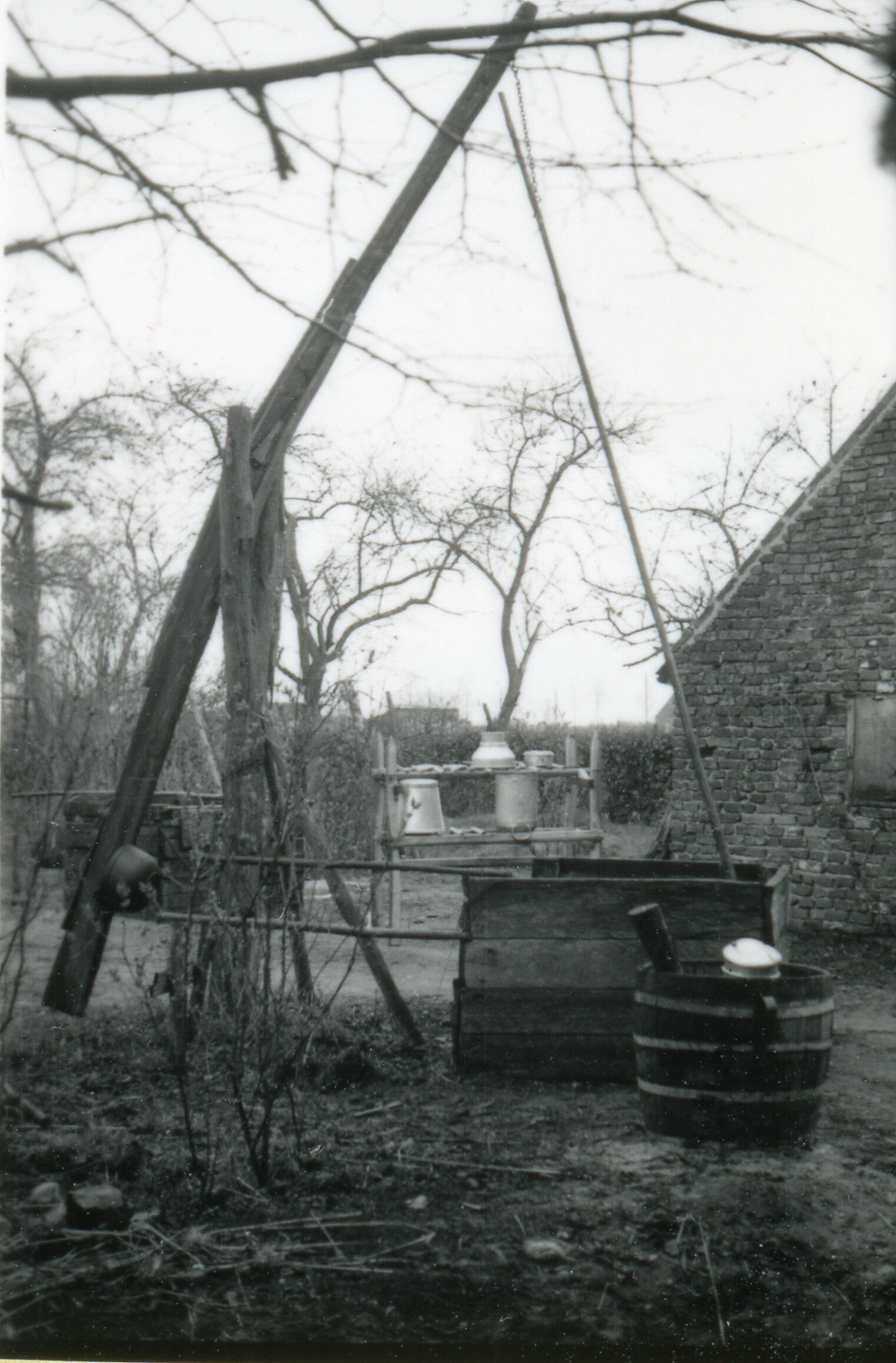 Een waterput met een puthaal, en een melkbussenrek naast een boerderij in het Brabantse Deurne.