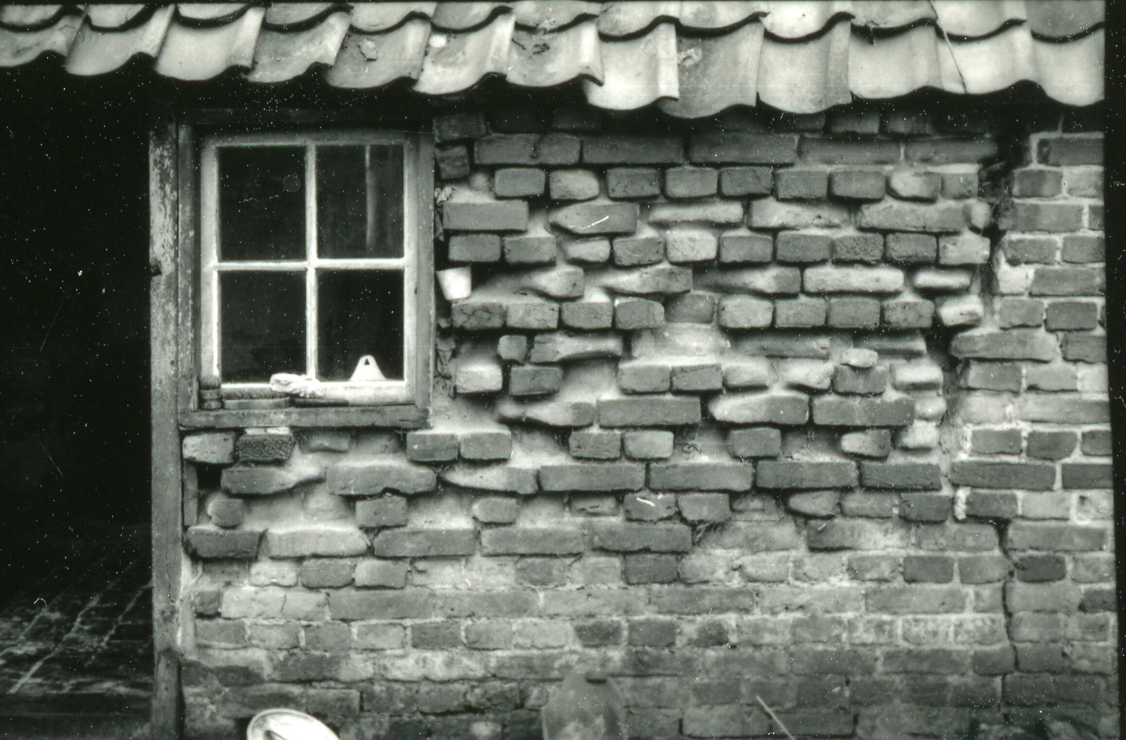 Uitgespoeld metselwerk van een muur, Deurne, 1940 (zwart-wit foto)