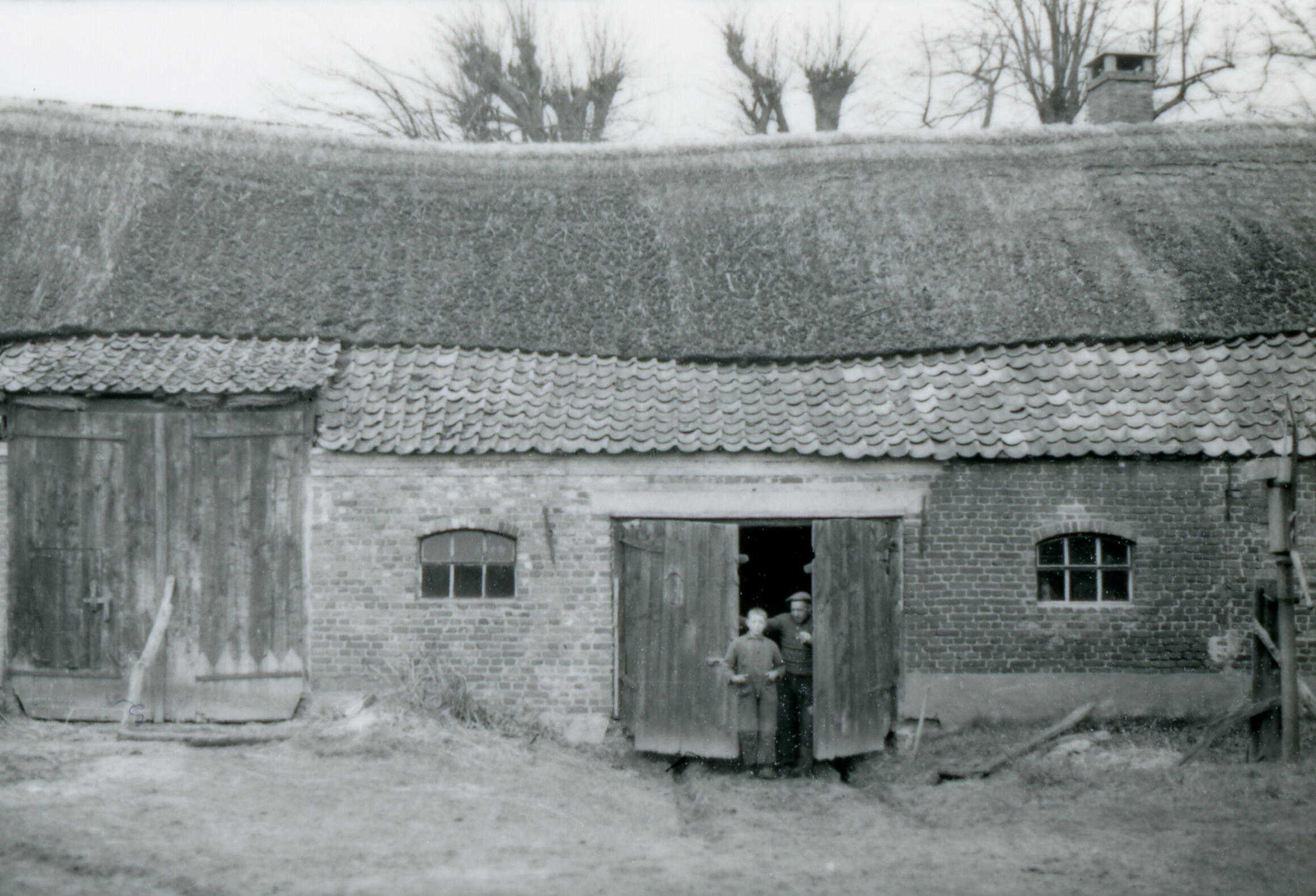Zijgevel van een boerderij in het Brabantse Deurne. In de deuropening van de zijbaander staan twee jongens. Rechts staat een mestpomp.