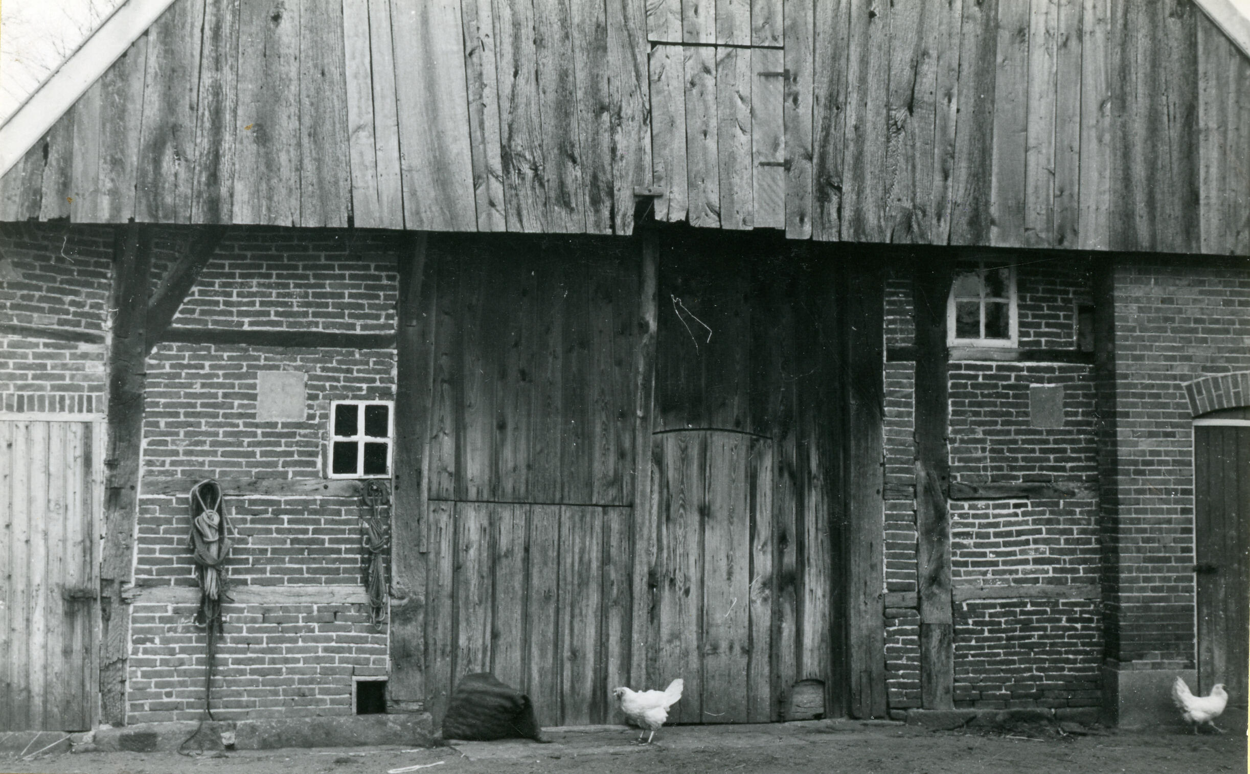 Achtergevel met baanderdeuren van een boerderij in het Overijsselse Berghum. De muren van de boerderij bestaan uit vakwerkbouw gevuld met bakstenen.