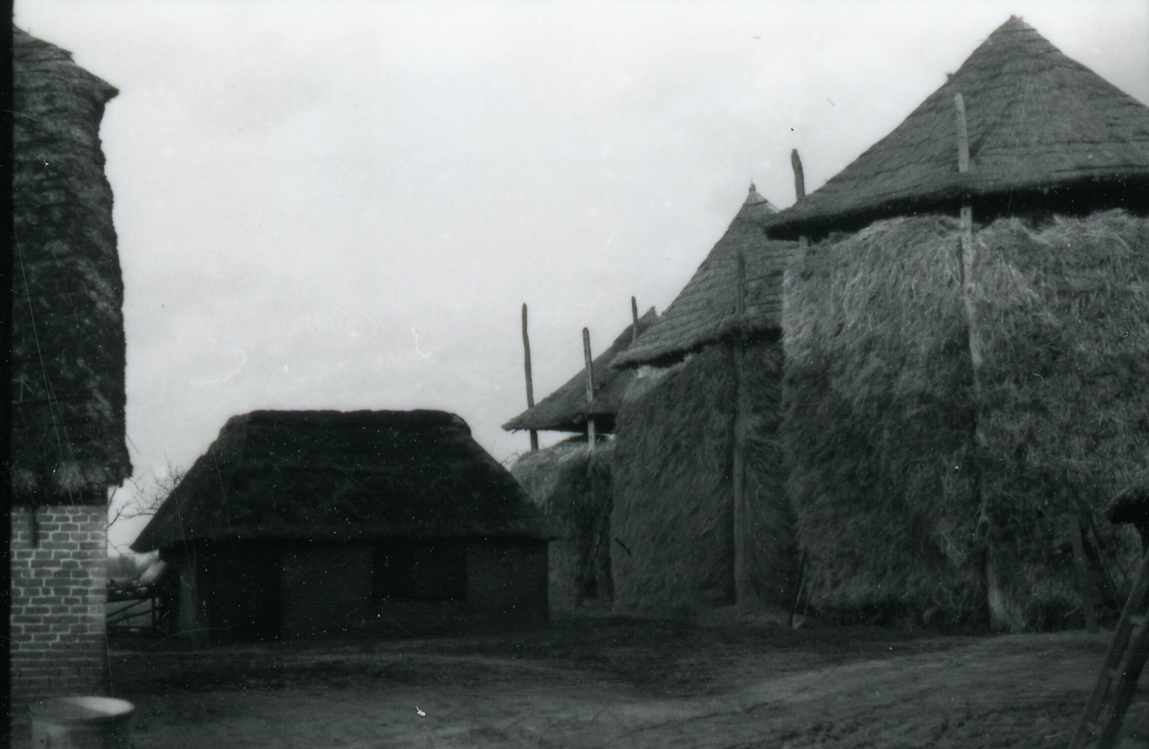 Hooibergen en een varkenshok, Achterberg, 1938 (zwart-wit foto)
