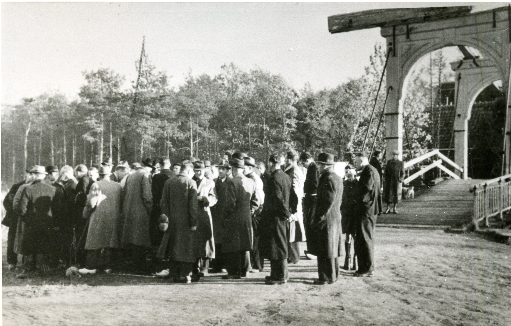 Een groep oorlogsevacués bespreekt de taakverdeling van die dag voor de dubbele ophaalbrug uit Ouderkerk aan de Amstel in het Nederlands Openluchtmuseum.