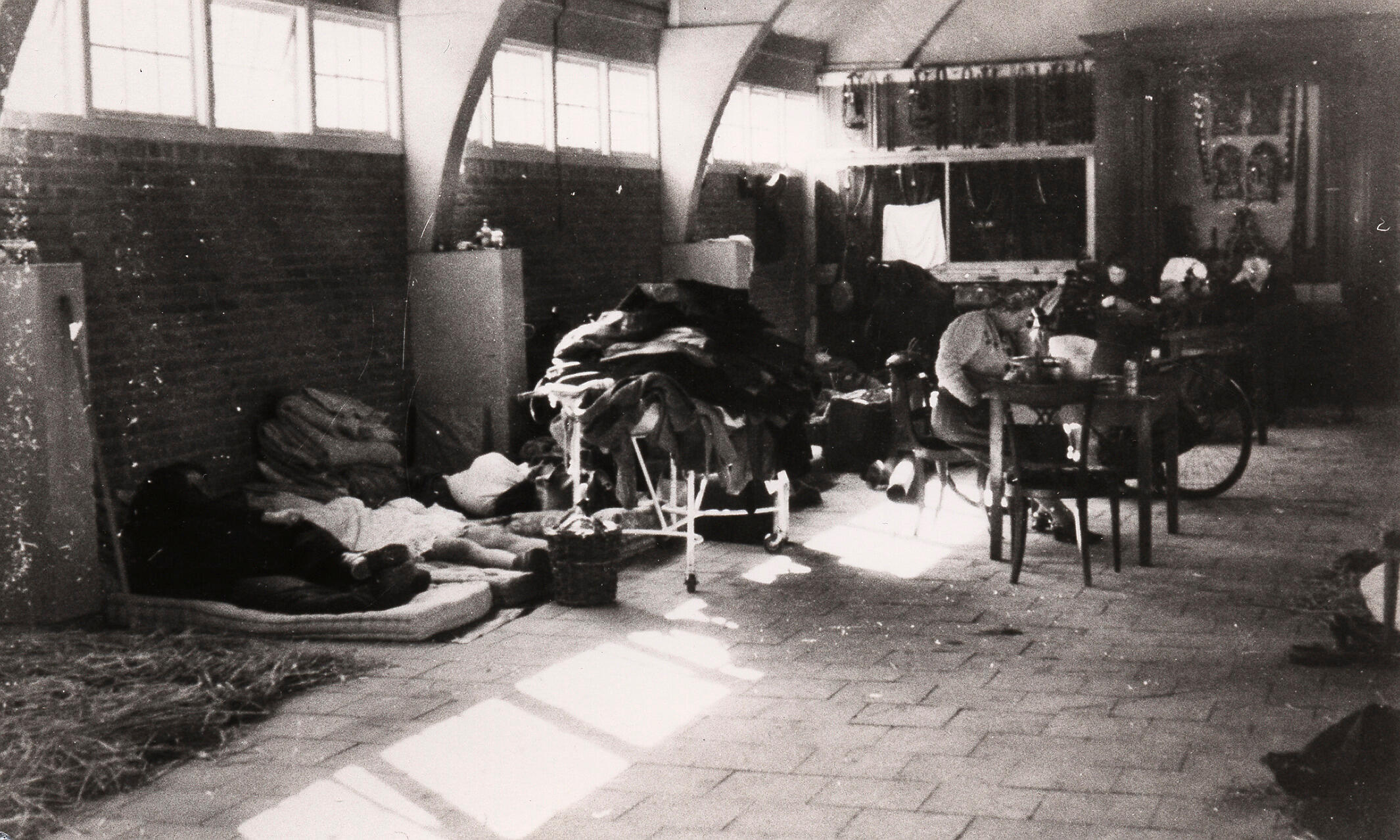 Slaapplaatsen voor Arnhemse oorlogsevacués in een van de tentoonstellingsgebouwen op het terrein van het Nederlands Openluchtmuseum. Het gebouw betreft een van de twee identieke Arnhemse loodsen die stonden op de plek van het huidige entreegebouw. Deze loods werd op 11 februari 1945 vernietigd door een neerstortende V1.