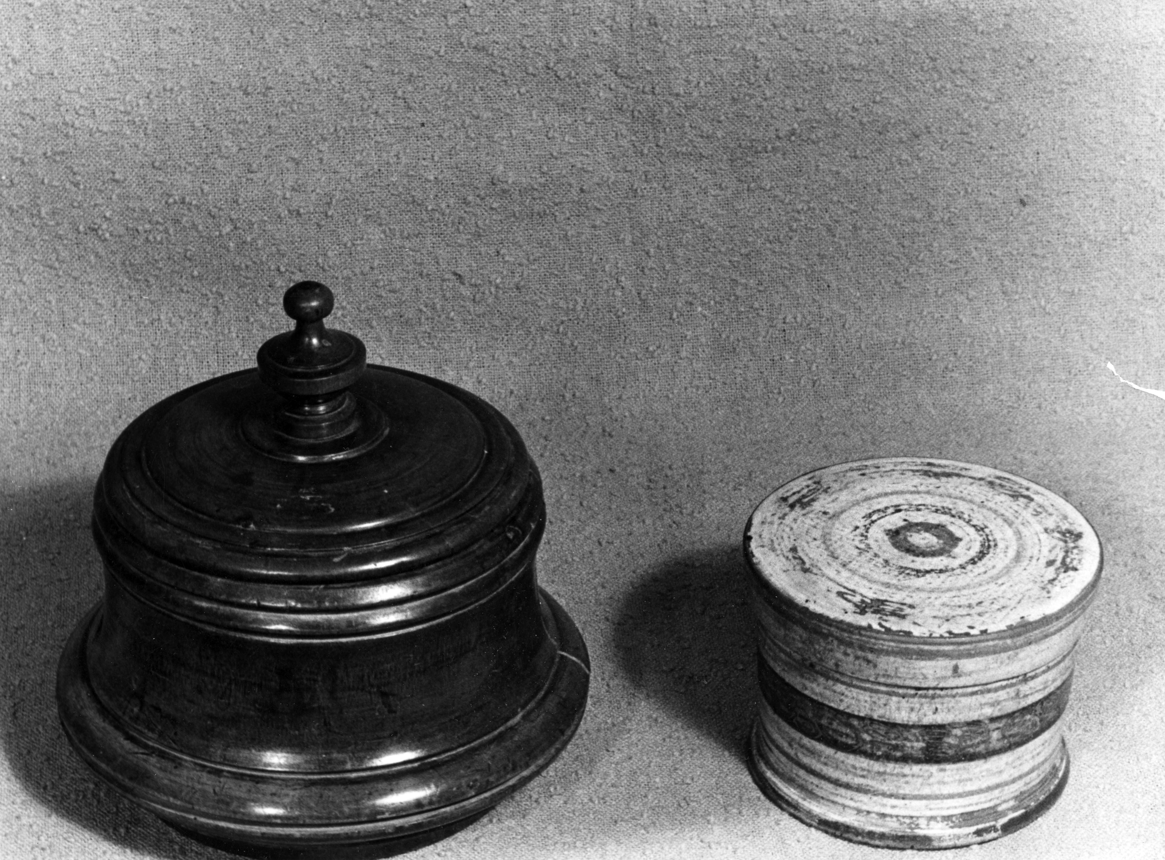 Houten tabakspot met een deksel en een rond houten doosje, gefotografeerd op Marken.