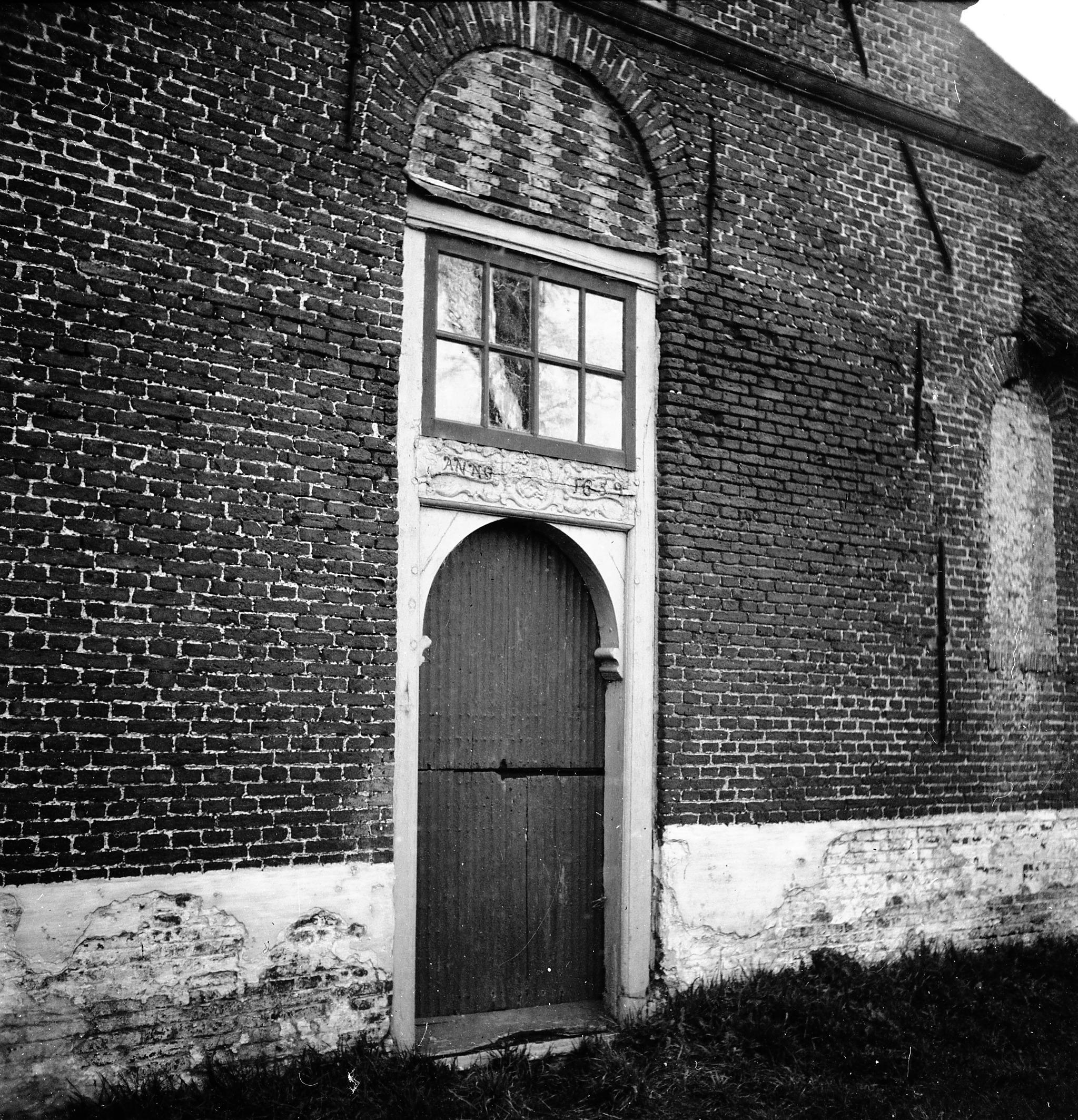Voordeur van stolpboerderij 'De Barmhartige Samaritaan' uit 1659 in Westerblokker. Boven de voordeur is in het deurkalf de Bijbelse voorstelling van de Barmhartige Samaritaan aangebracht. In de boog boven de deur worden rode en gele bakstenen afgewisseld.