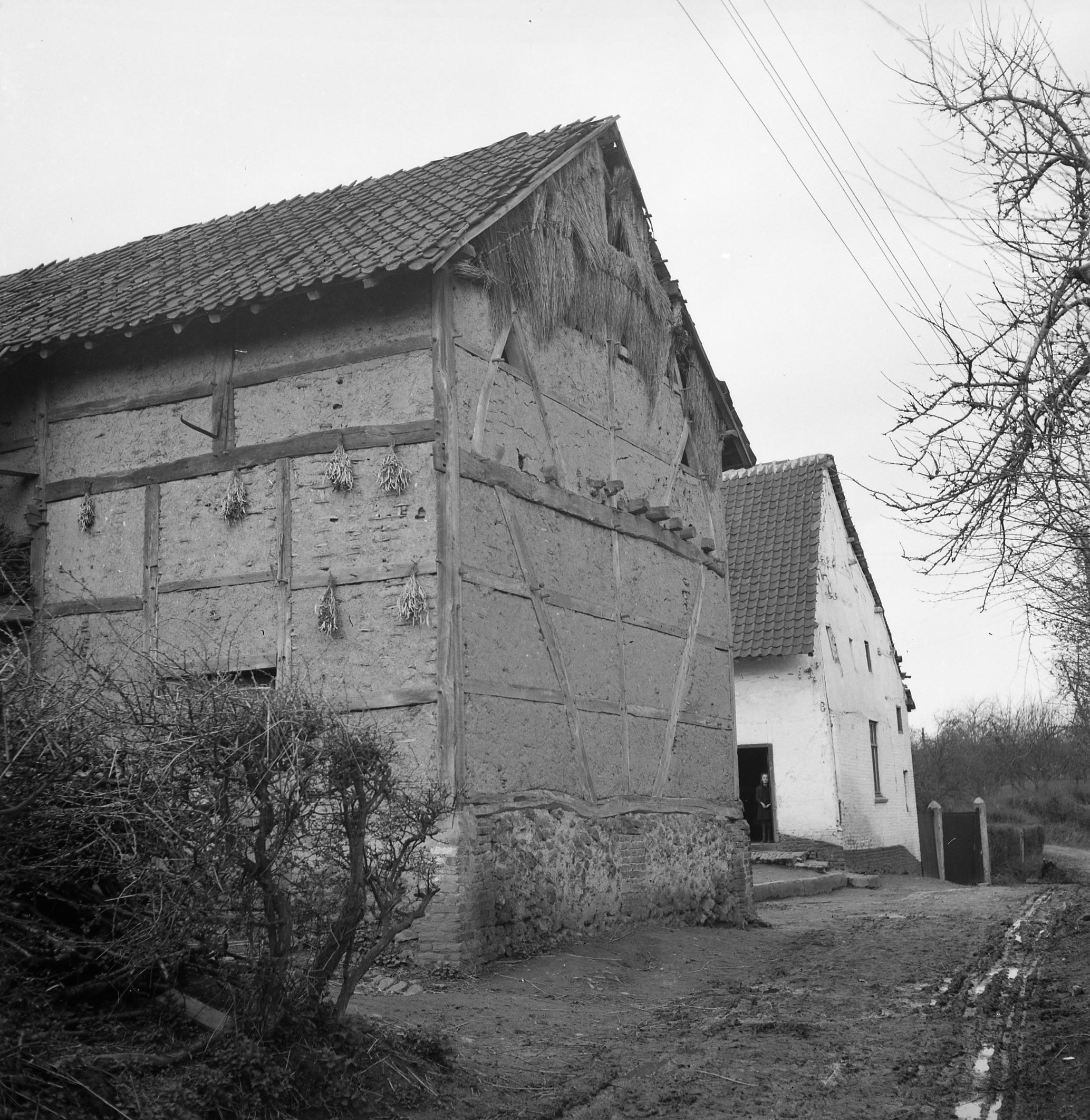 Limburgse hoeve in Herkenrade. De wanden zijn deels van vakwerk met leem, met onderaan bakstenen en veldkeien.