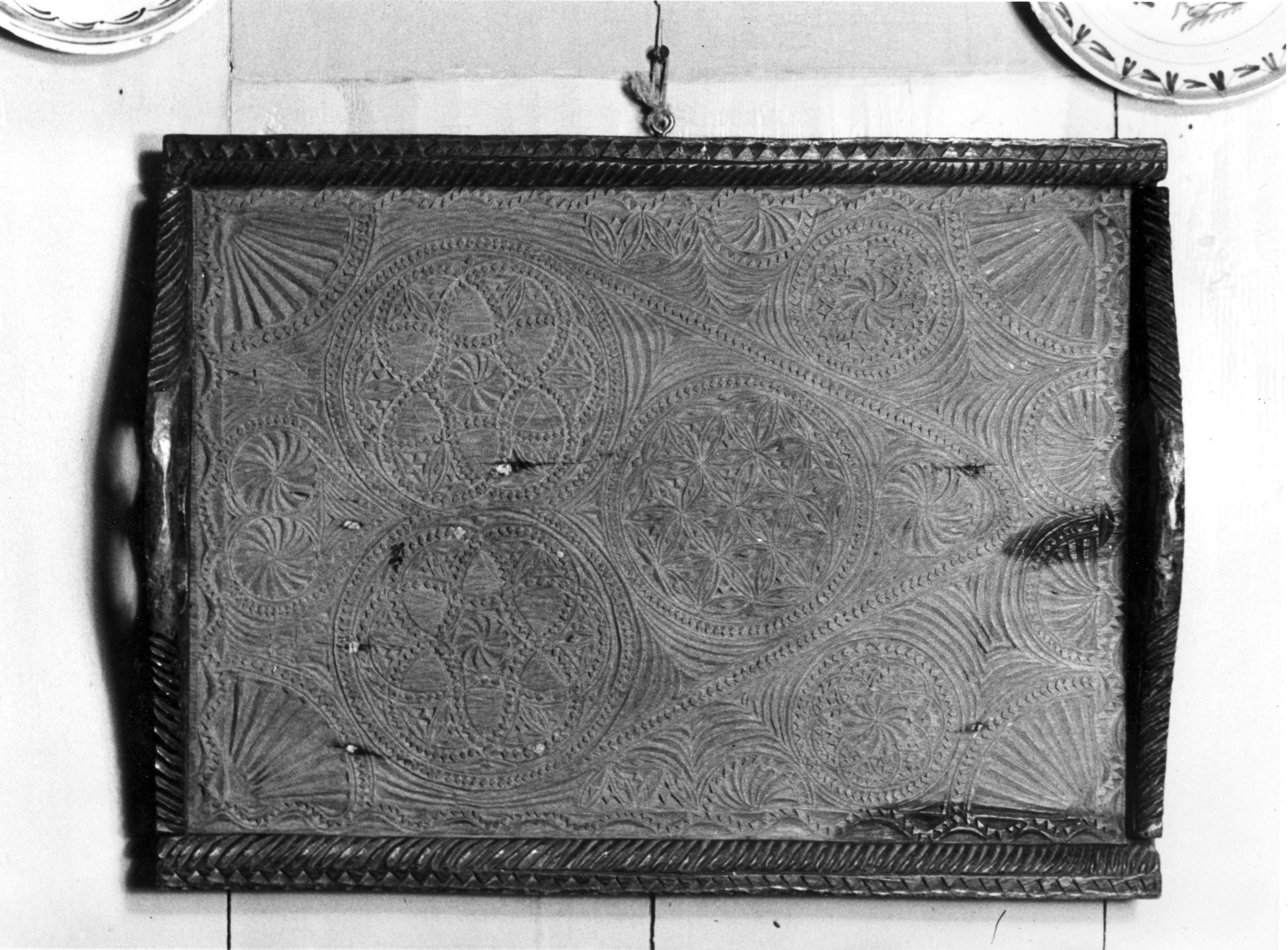 Theeblad, versierd met kerfsnede, in een woning op Marken.