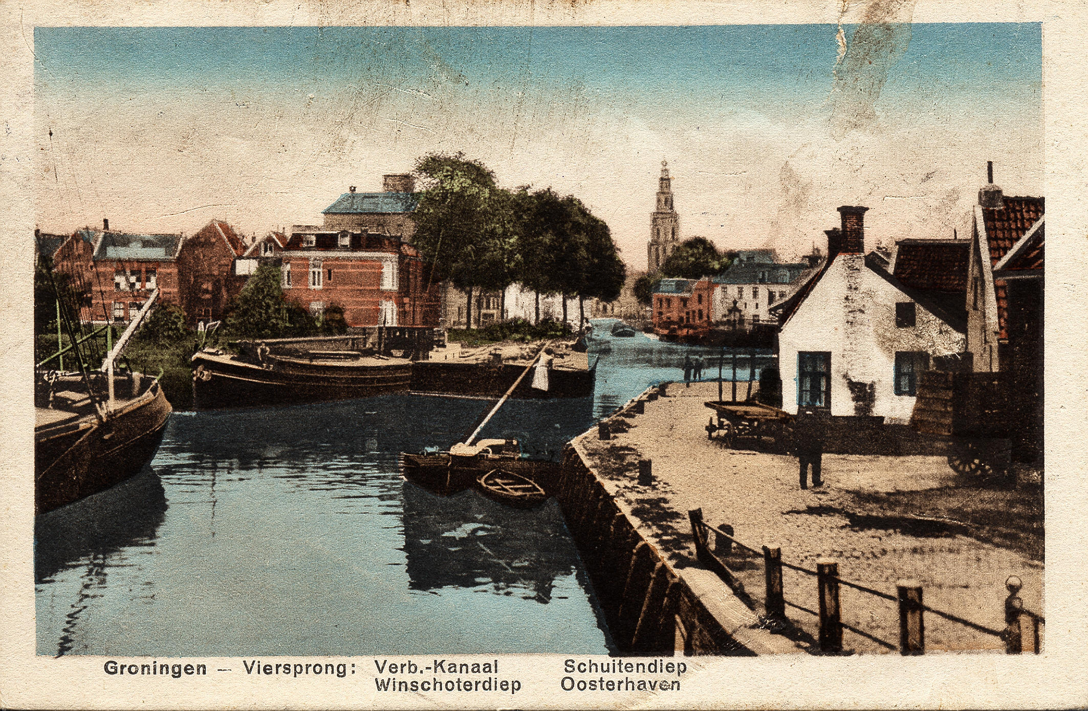 Ingekleurde ansichtkaart met een stadsgezicht in Groningen. Op dit punt komen vier wateren bijeen: het Verbindingskanaal, het Winschoterdiep, het Schuitendiep en de Oosterhaven.