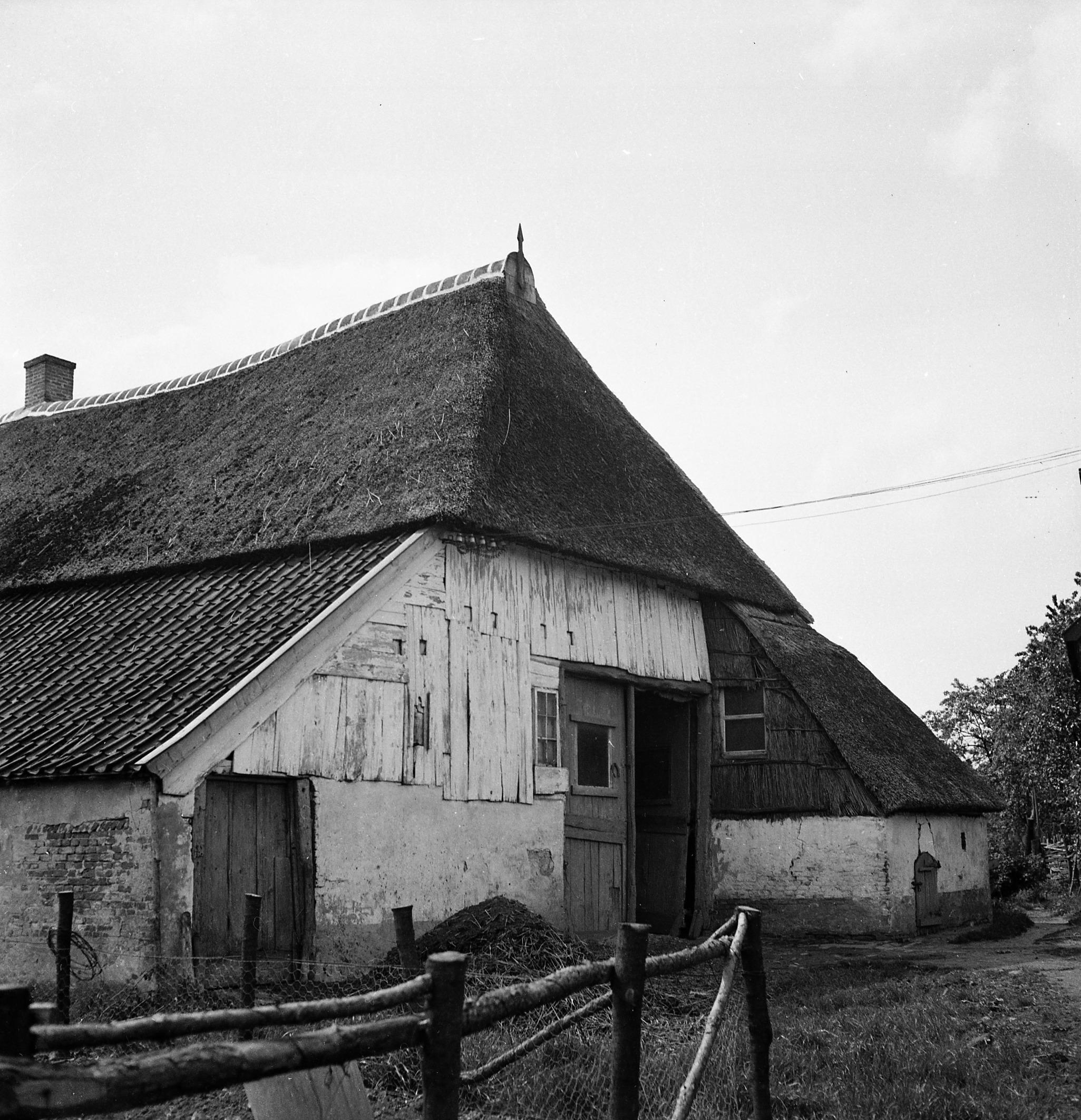 Achtergevel van een boerderij in Gendt. Het dak is gedeeltelijk van riet en gedeeltelijk van dakpannen. In de uitbouw aan de achterzijde zit een varkenshok.