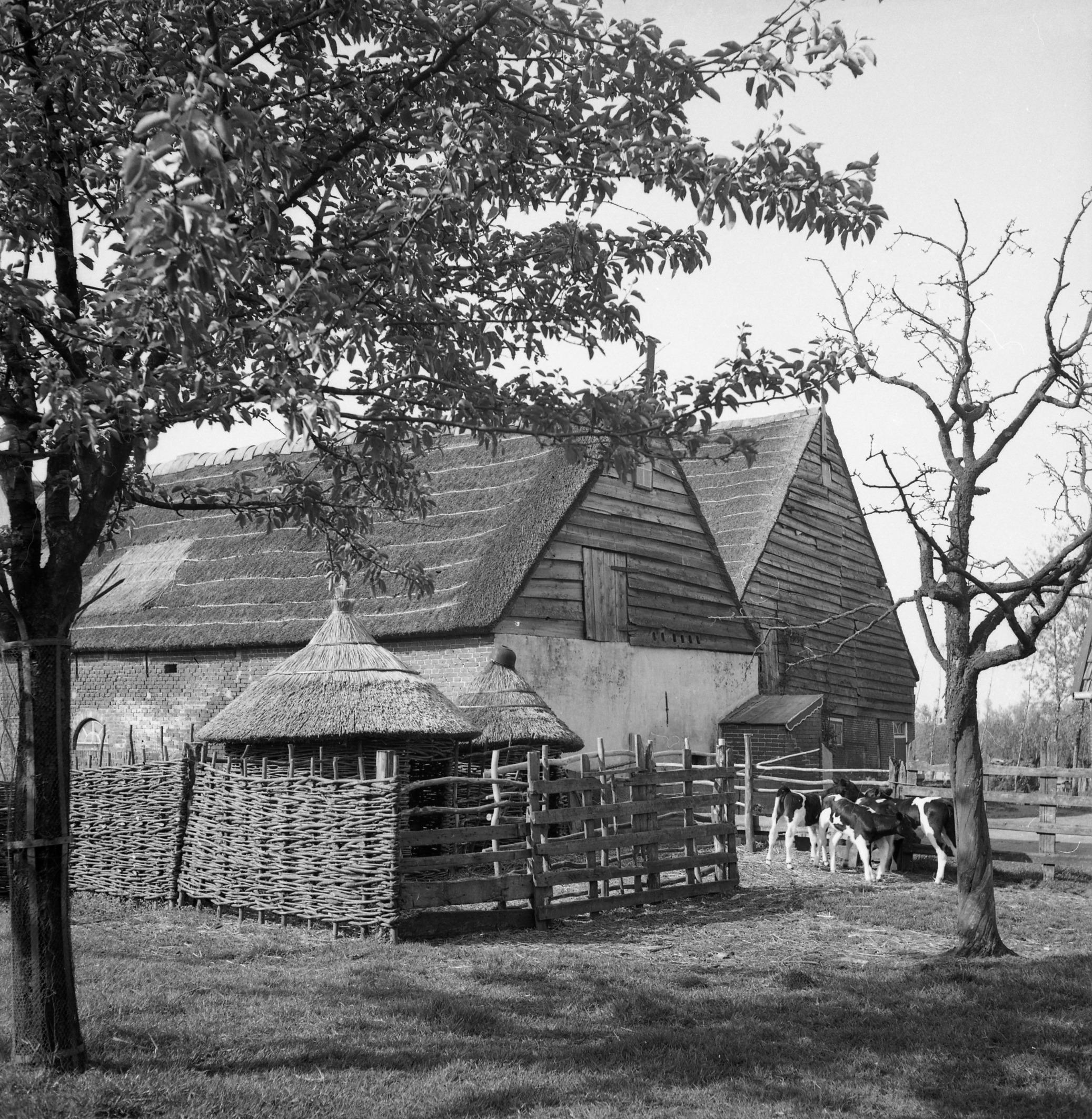 Kalverweide op het erf van een boerderij in Goudriaan. Op het erf staan ronde schuilhutten van gevlochten teenhout met rieten daken en links daarvan schermen van gevlochten teenhout.