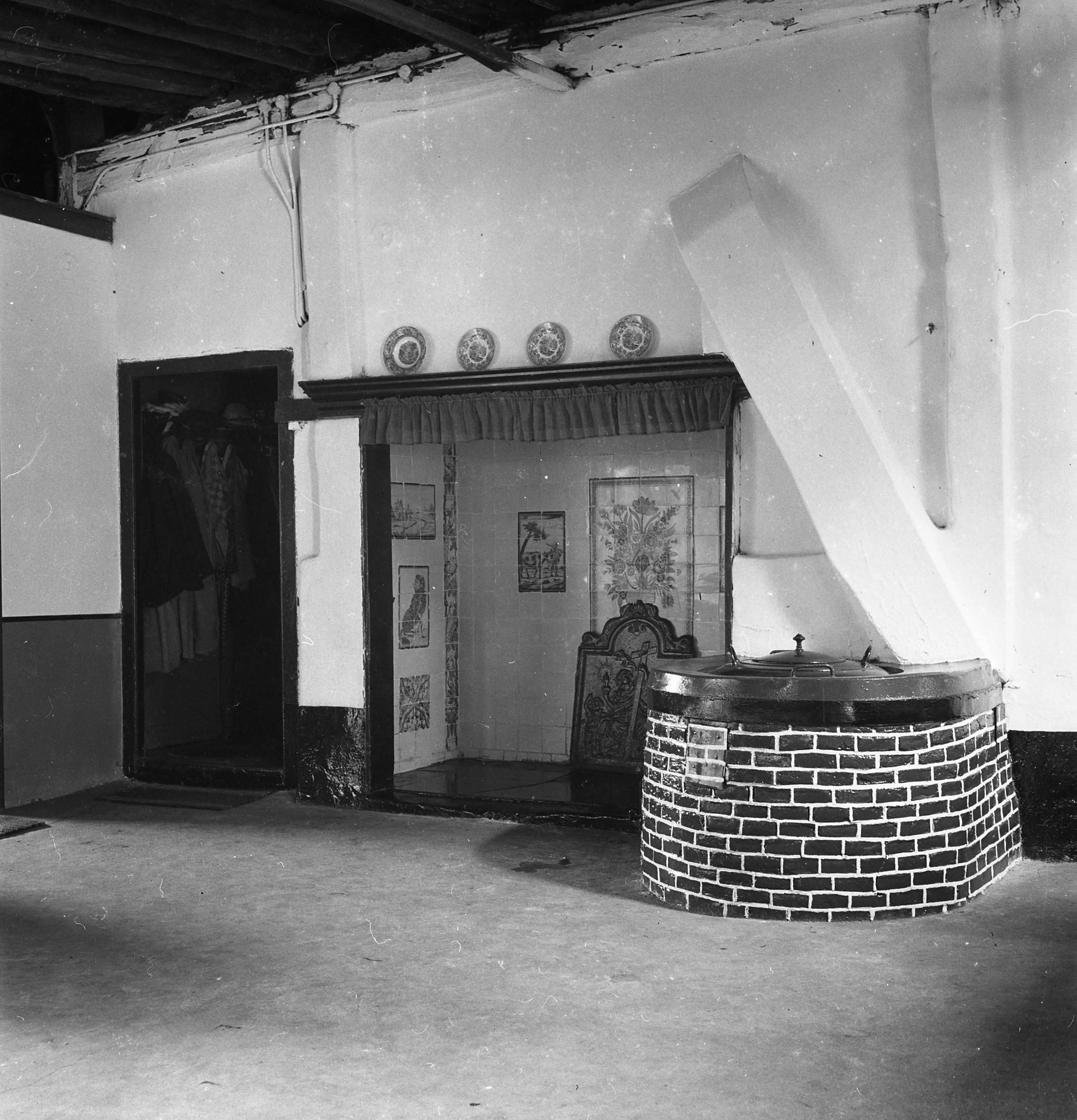 Bedrijfsgedeelte van een boerderij in Blaricum. De ruimte heeft een ingebouwde haardpartij met tegeltableaus en een gietijzeren haardplaat met een voorstelling. Rechts staat een gemetseld fornuis voor de bereiding van veevoer.