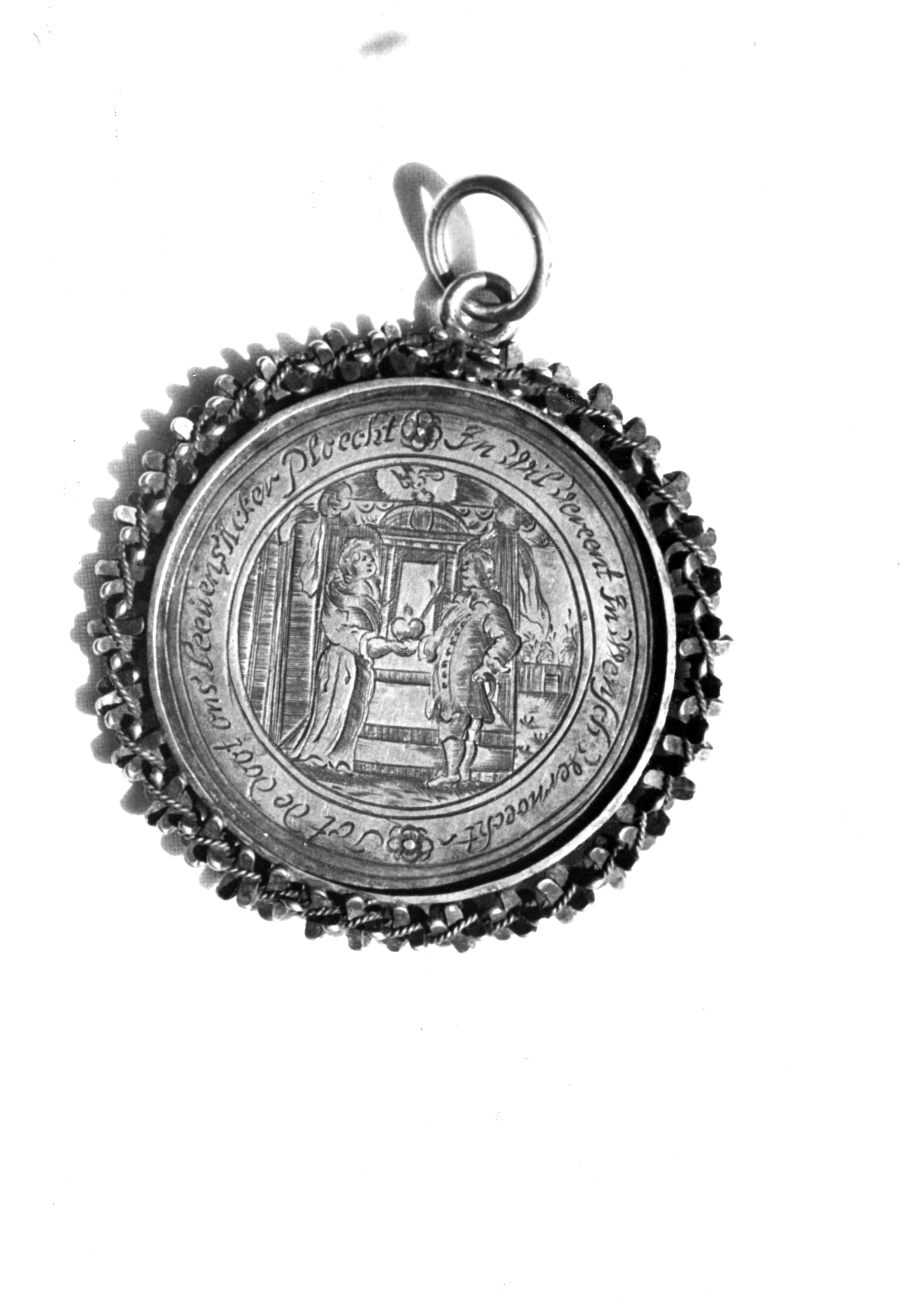 Medaille met een gevlochten rand en een ophangoog, gefotografeerd op Marken. In het midden staat een voorstelling van een vrouw en man met een appel. De randtekst luidt: 'In Wil Vereent, In Wensch Vernoecht, Tot de doot ons leevensacker ploecht'.