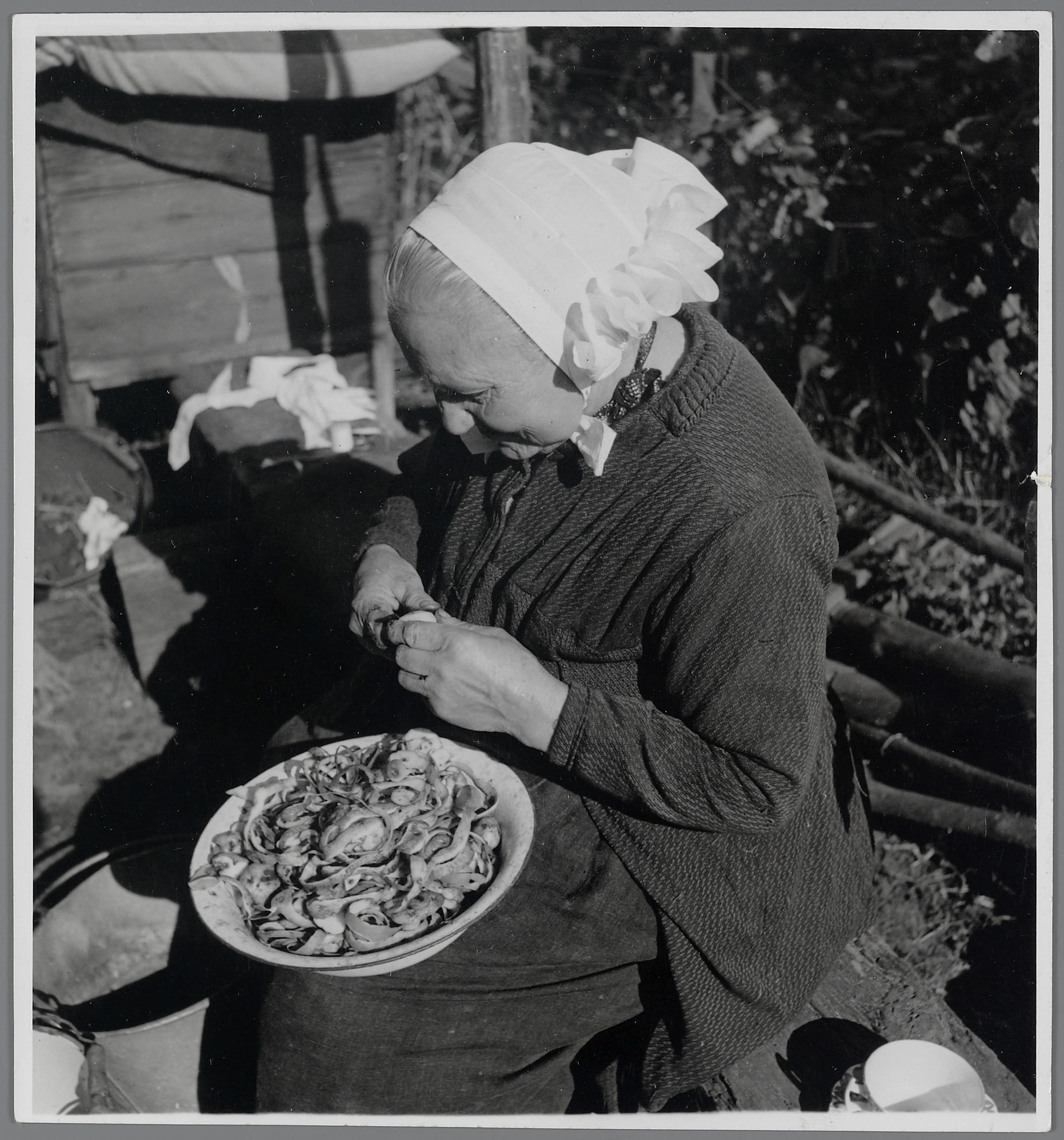 Vrouw in Sallandse streekdracht. De vrouw is gekleed in daagse dracht en schilt aardappelen.