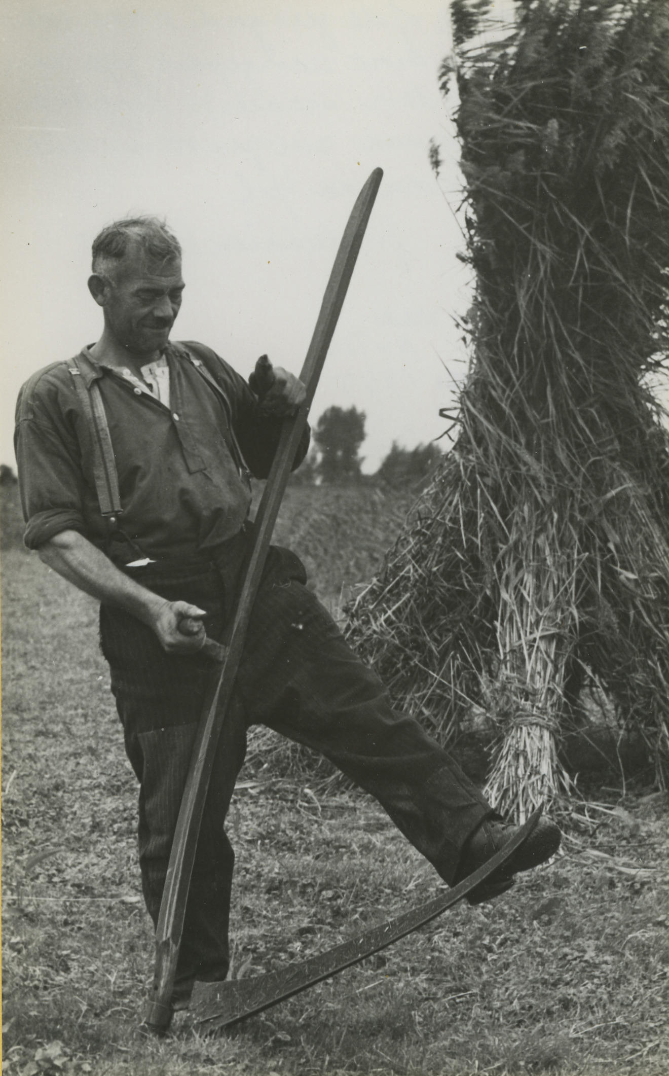 Rietmaaier met zeis bij Veessen, 1945 (zwart-wit foto)