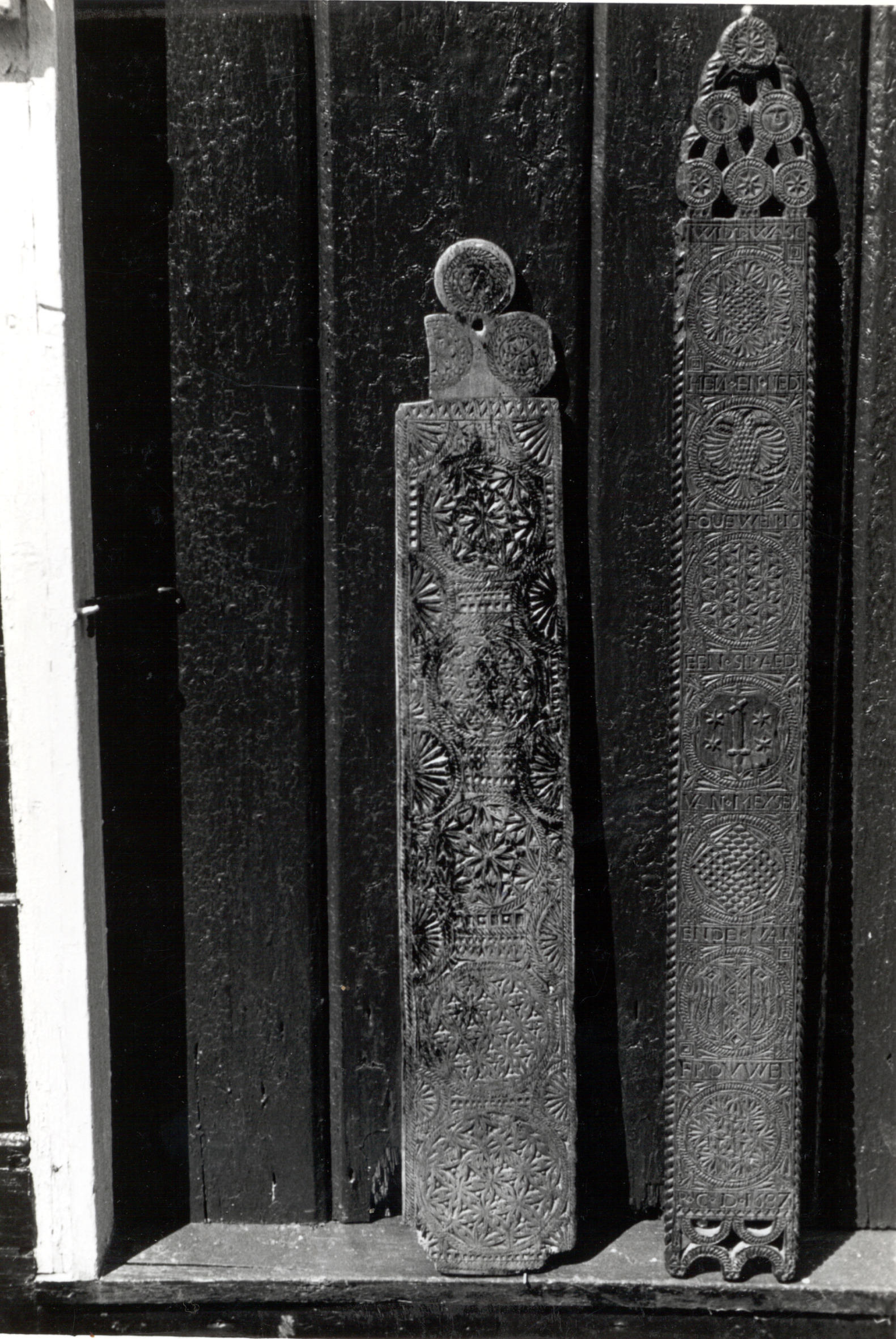 Twee mangelplanken, voorzien van houtsnijwerk. De rechter plank is gemaakt in 1687. De planken zijn gefotografeerd op Marken.