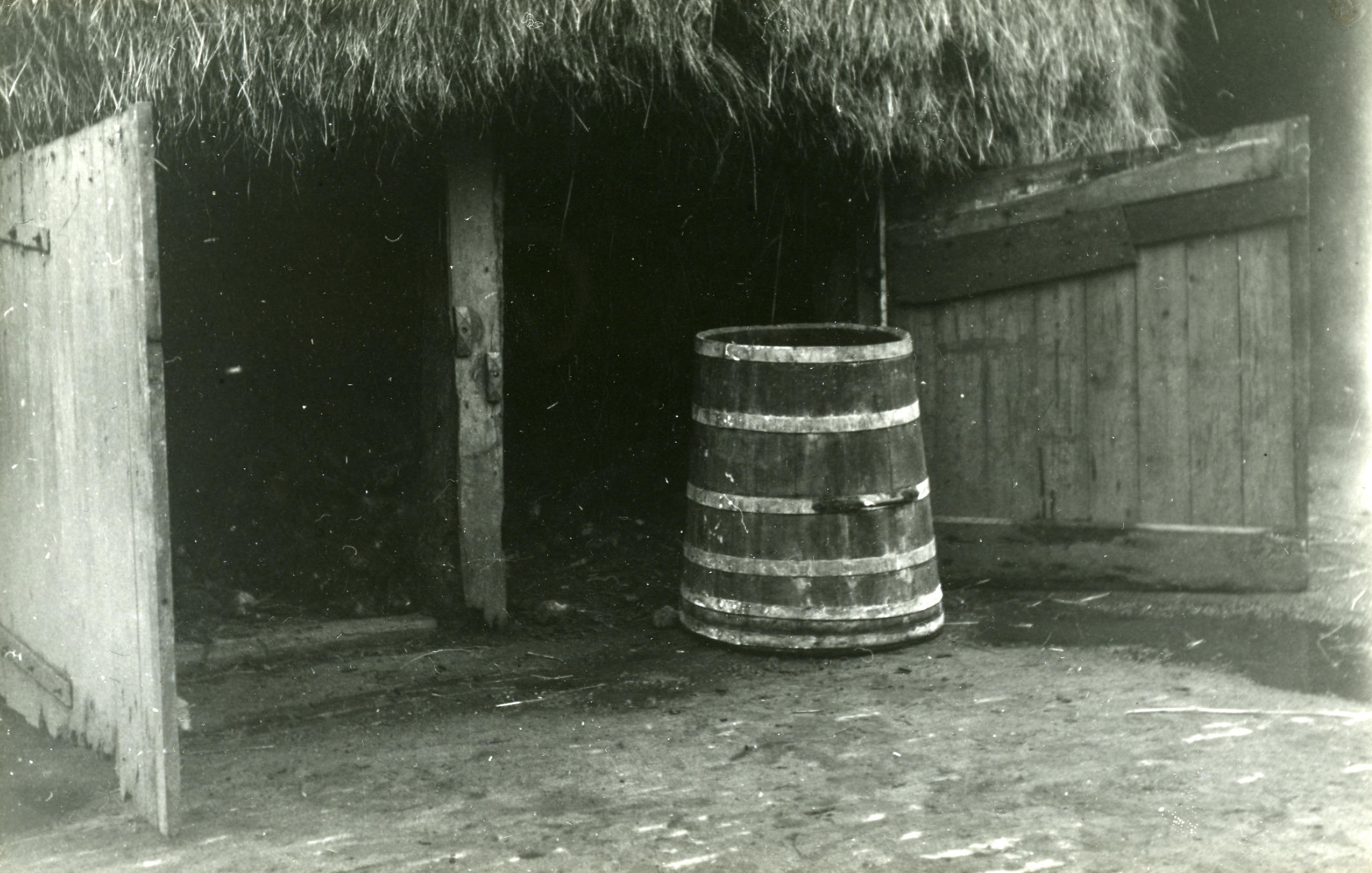 Vleeston voor het bewaren van geconserveerd vlees bij een boerderij in Veessen. De ton staat voor een bergplaats die gesitueerd is onder de hooiberg.