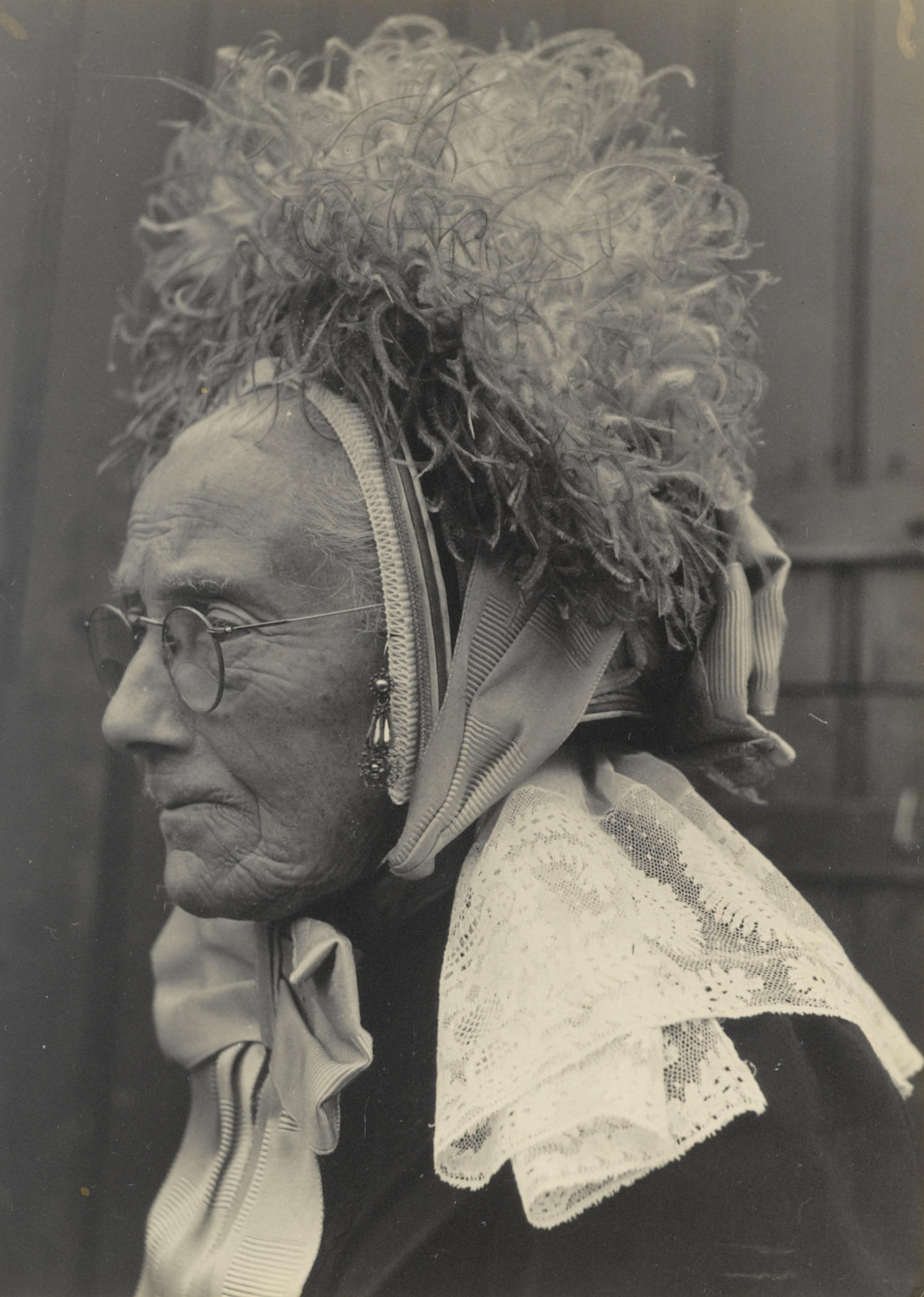 Weduwe A. Smit-Reinders uit Veessen, gekleed in Gelderse streekdracht. Mevrouw Smit is gekleed in de zondagse dracht voor de zomer. Ze draagt over haar 'knipmuts' (kornetmuts) een strohoed, versierd met veren en gesloten met een strik onder de kin.
