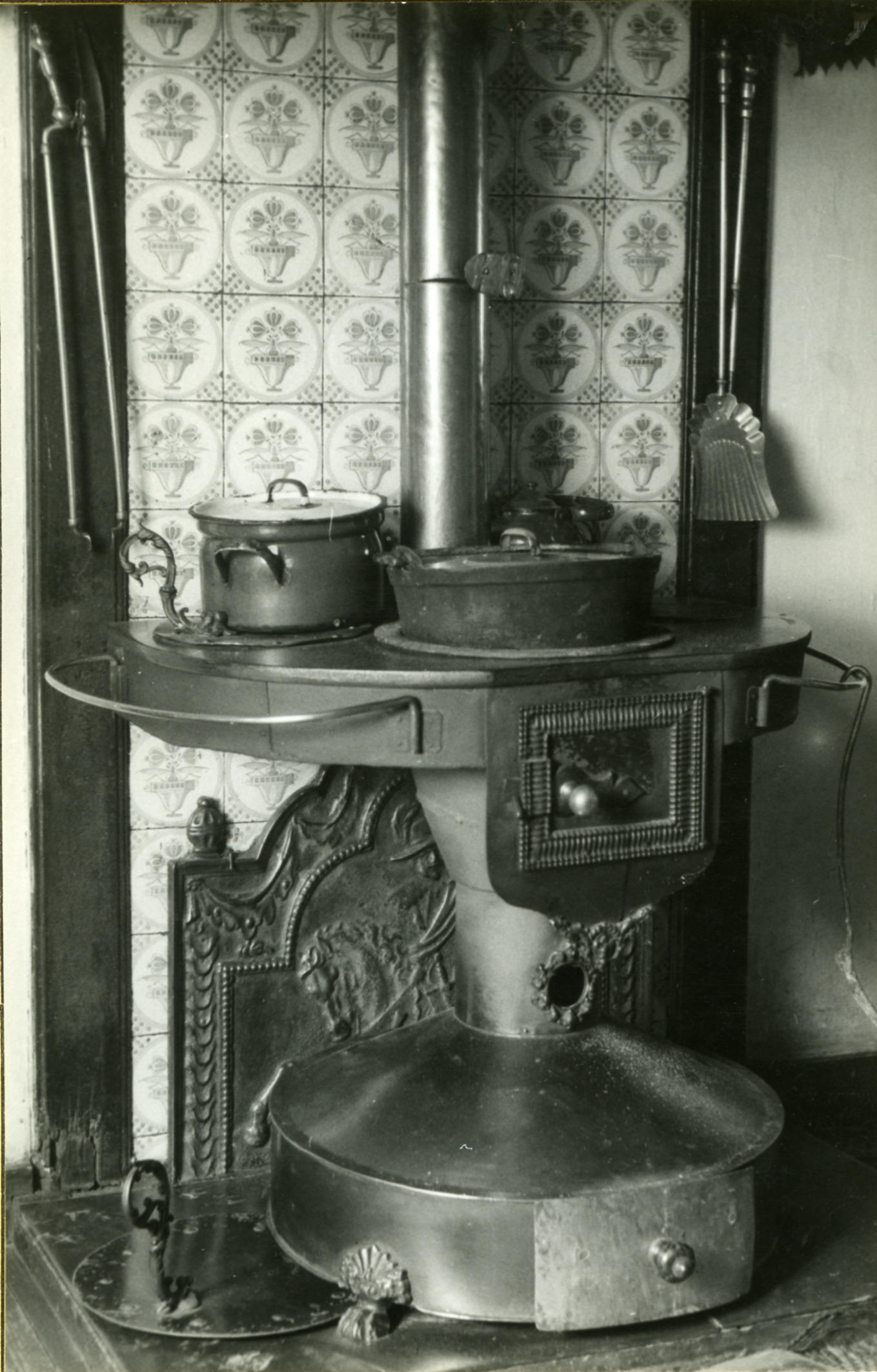 Plattebuiskachel in een woning in Veessen. De kachel is geplaatst op de plaat waar vroeger een open vuur brandde, tegen de betegelde wand met ijzeren haardplaat.