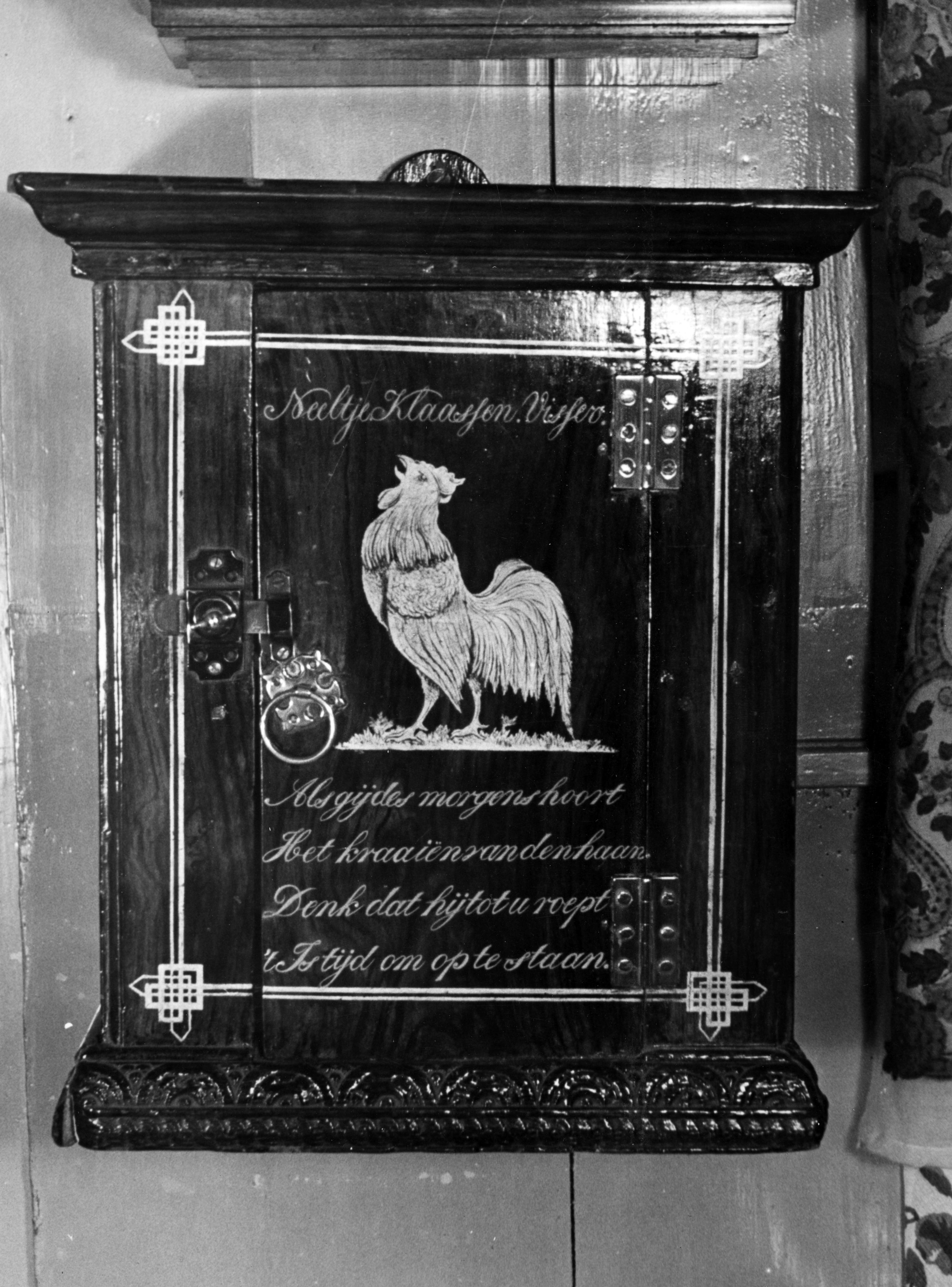 Houten wandkastje, beschilderd met houtimitatie, in een woning op Marken. Op het deurtje is een haan geschilderd met daarboven de naam 'Neeltje Klaassen Visser' en eronder de tekst: 'Als gij des morgens hoort Het kraaiën van den haan. Denk dat hij tot u roept 't Is tijd om op te staan.'