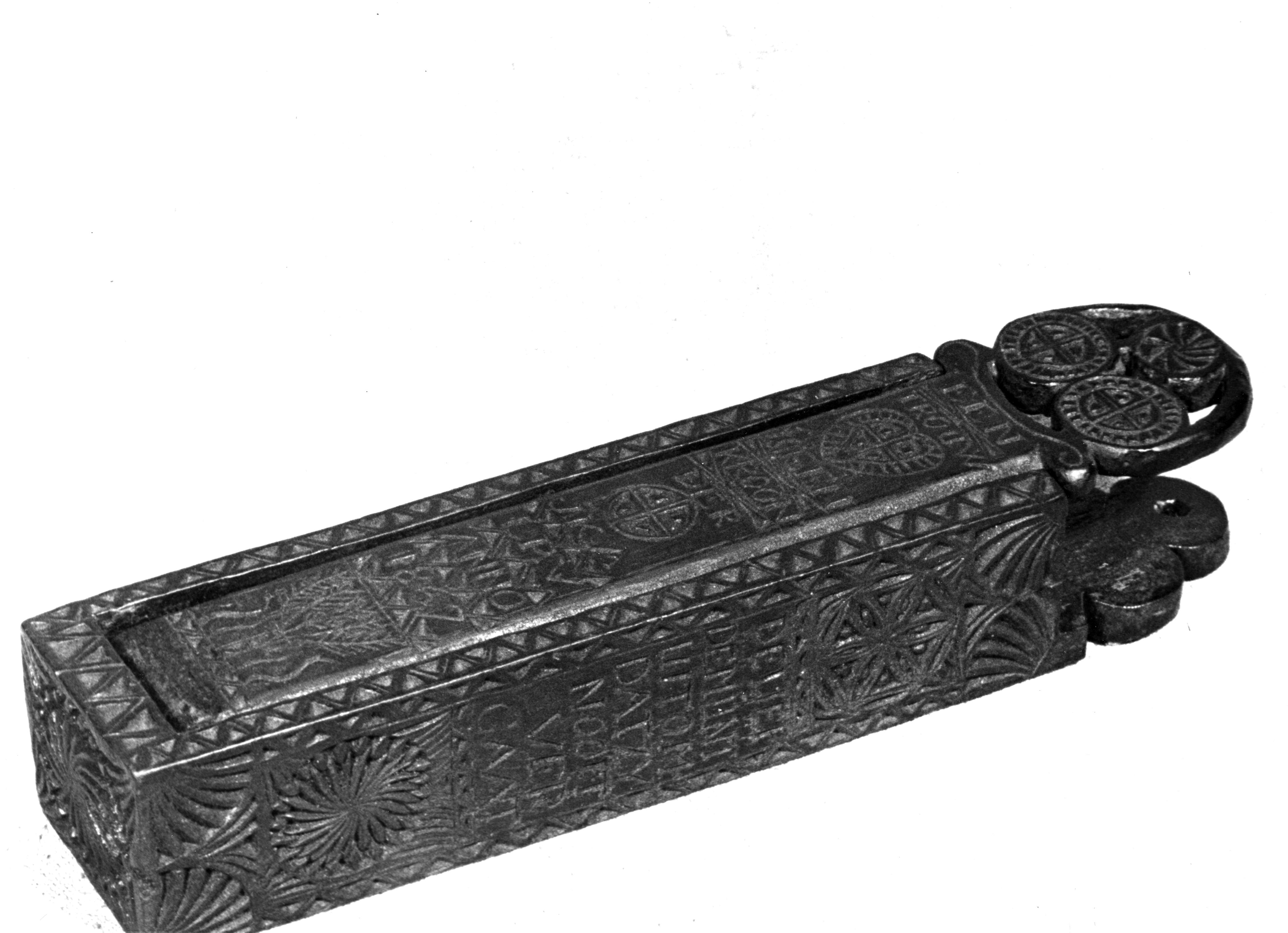 Scheerdoos met schuifdeksel, gefotografeerd op Marken. De scheerdoos is versierd met kerfsnede en voorzien van het jaartal 1867.