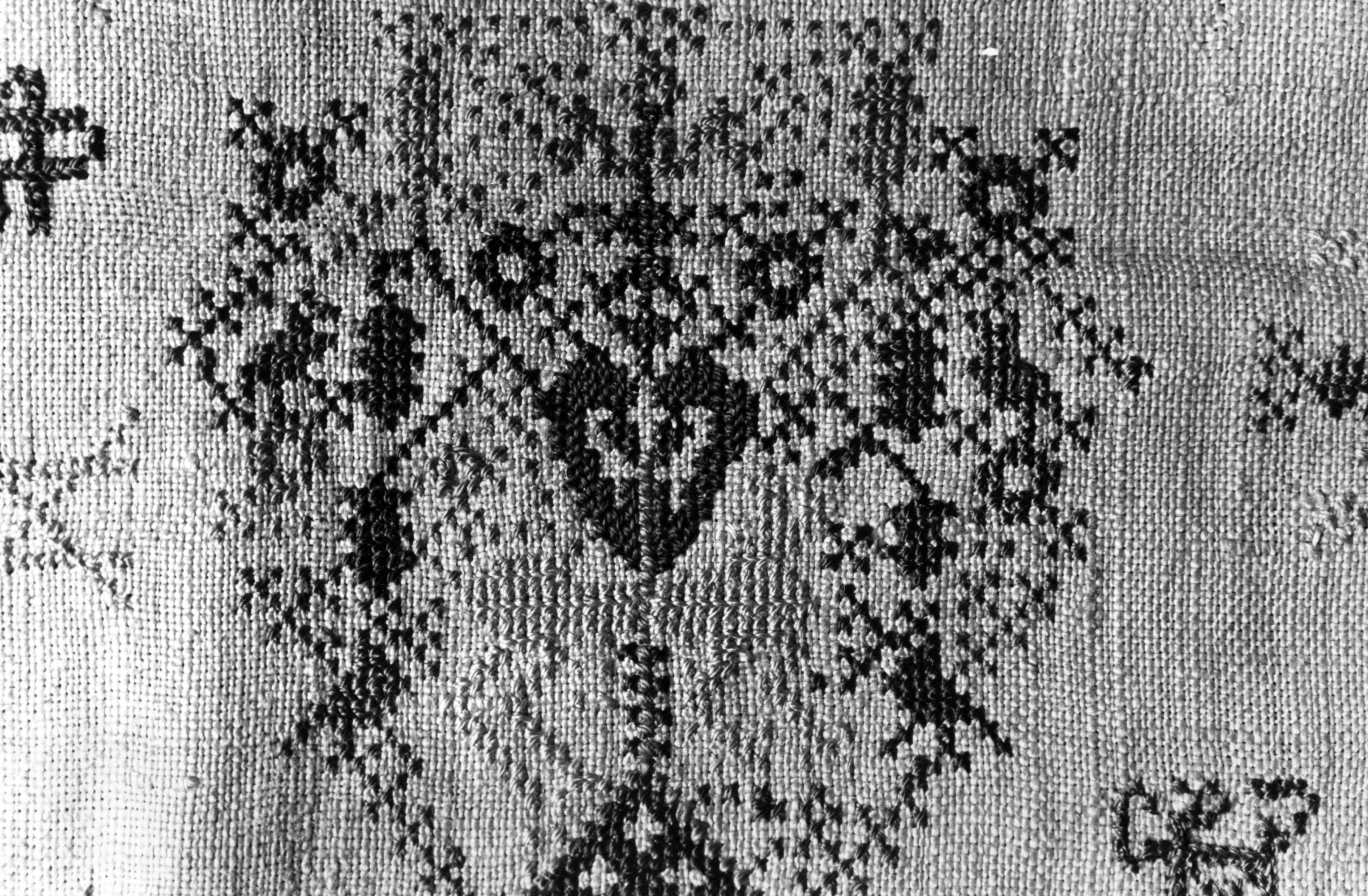 Detail van een merklap uit 1670, Marken, 1943 (zwart-wit foto)