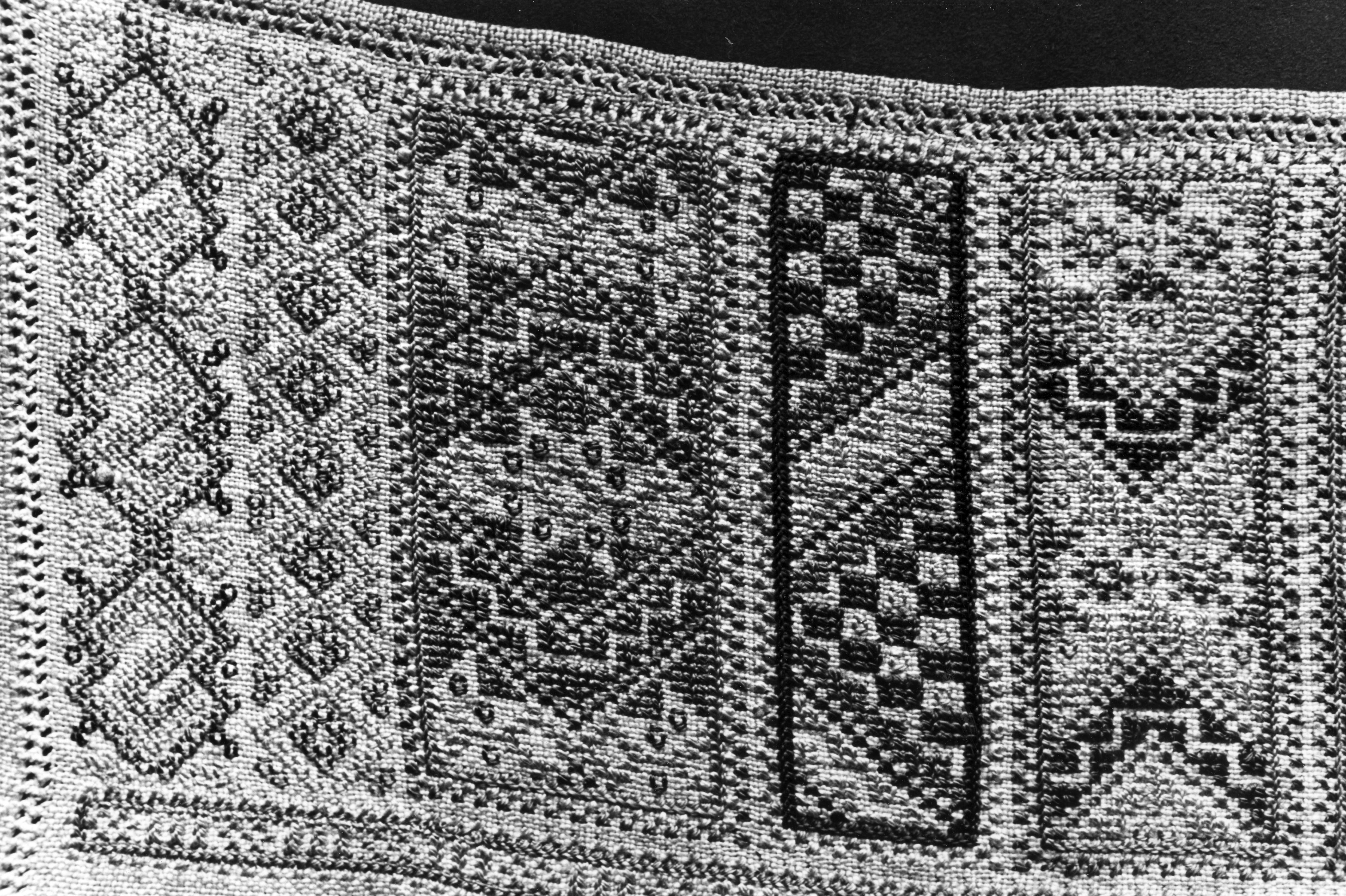 Detail van een merklap uit 1670, Marken, 1943 (zwart-wit foto)