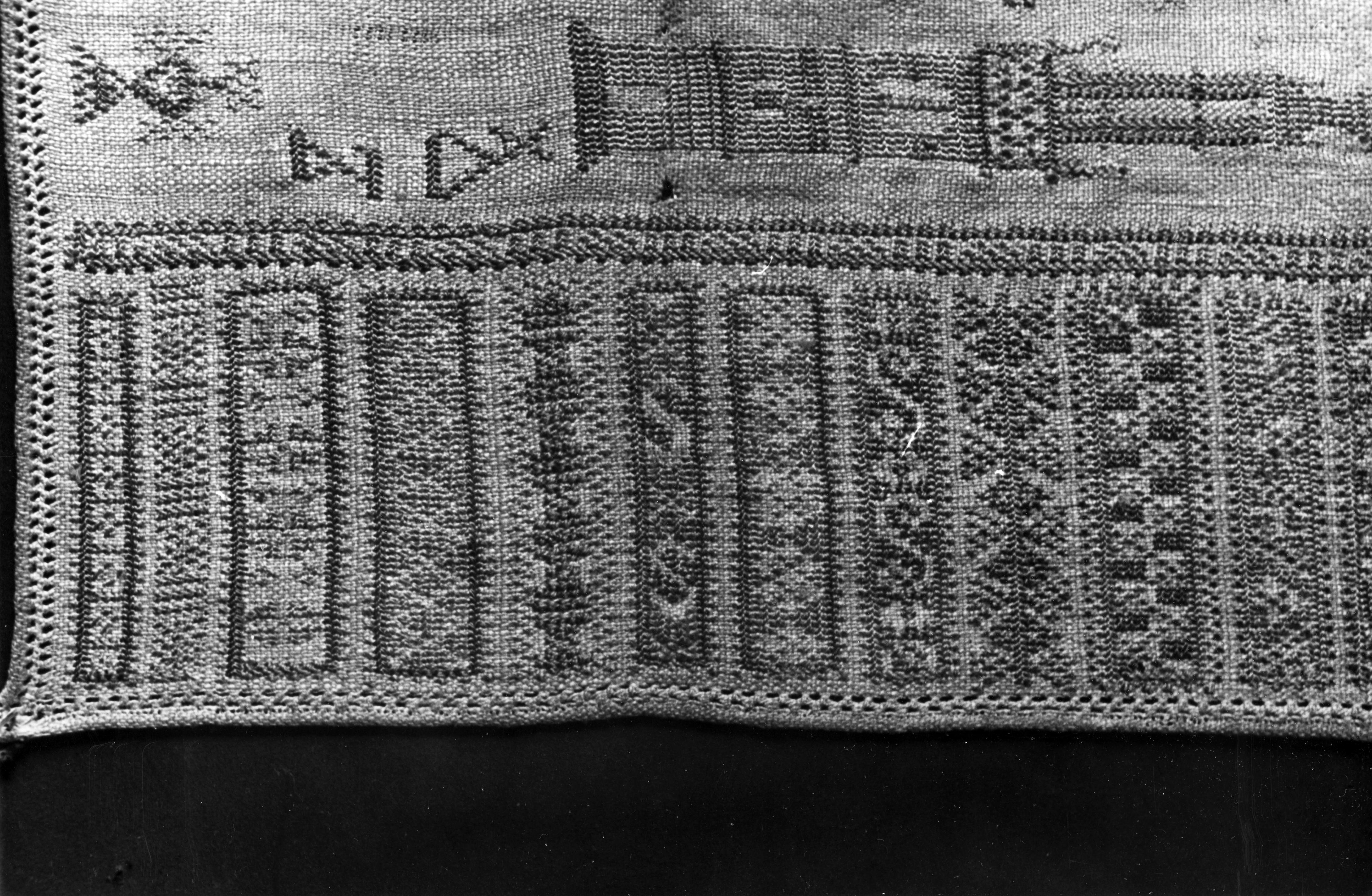 Detail van een merklap uit 1640, Marken, 1943 (zwart-wit foto)