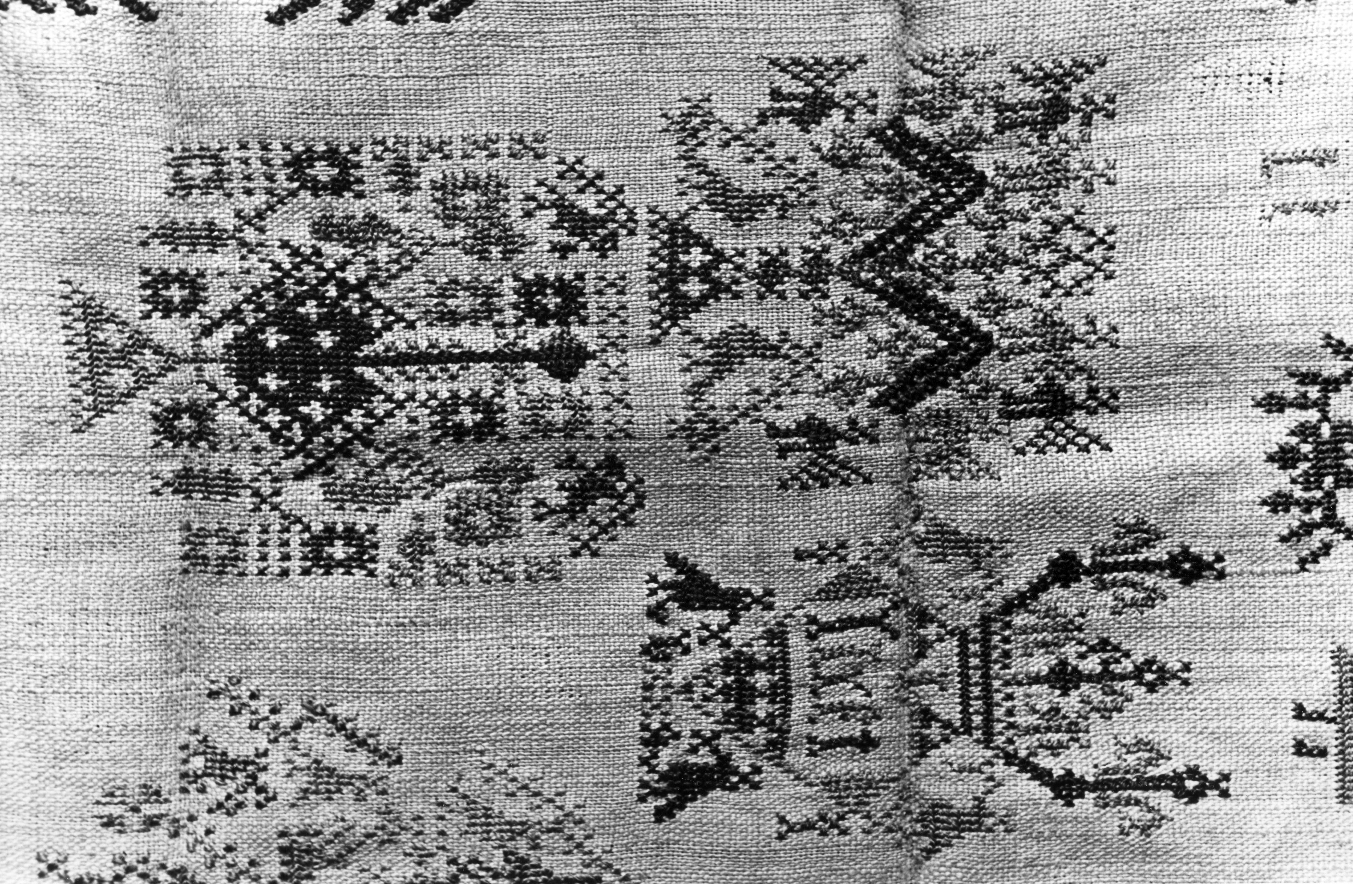 Detail van een merklap uit 1640, Marken, 1943 (zwart-wit foto)