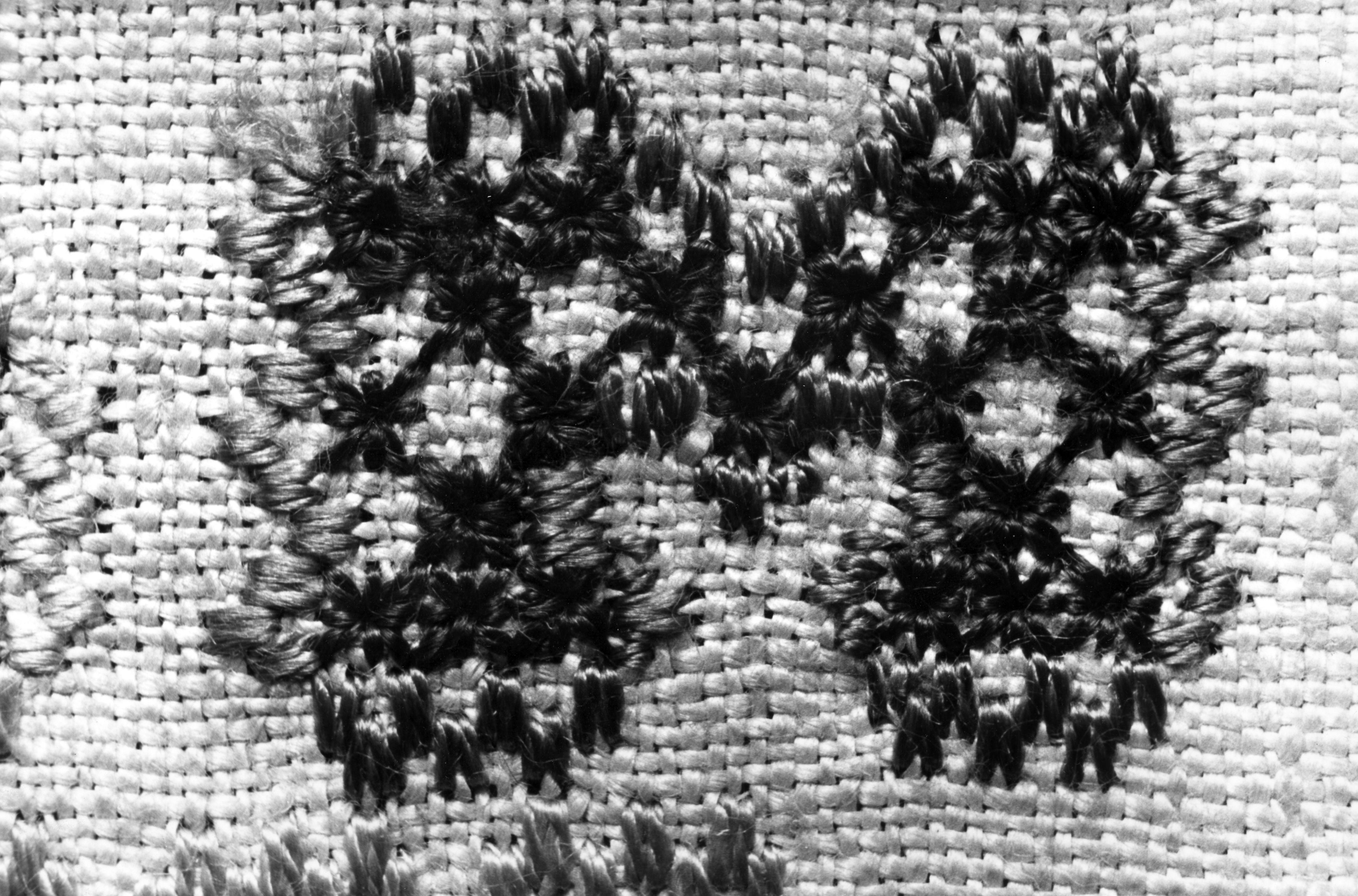 Detail van een merklap uit 1640, Marken, 1943 (zwart-wit foto)
