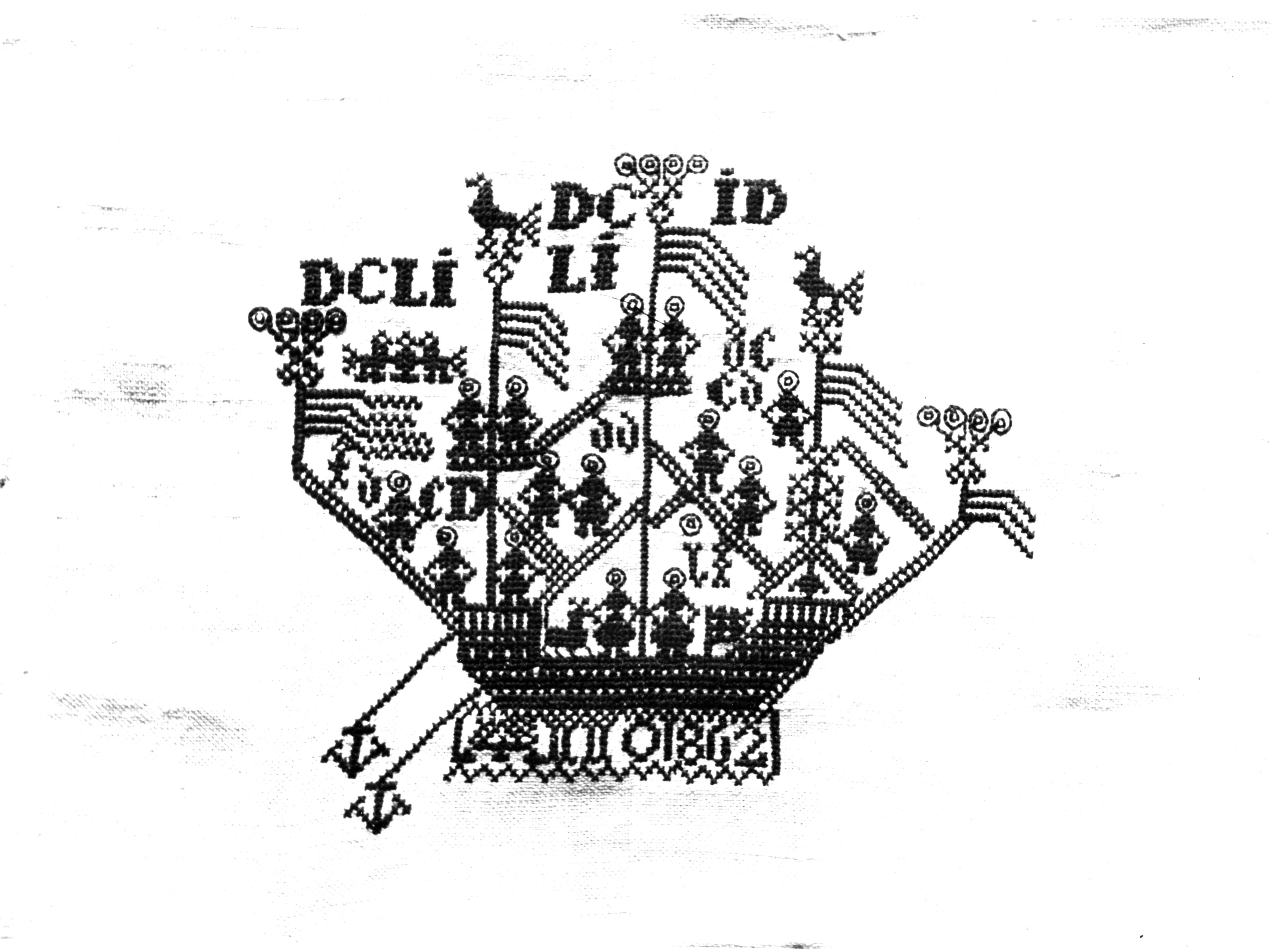 Detail van een zogenoemd spreitje, gebruikt op een pronkbedstede op het eiland Marken, met een voorstelling van een schip in kruissteekborduurwerk en de datering 1862.