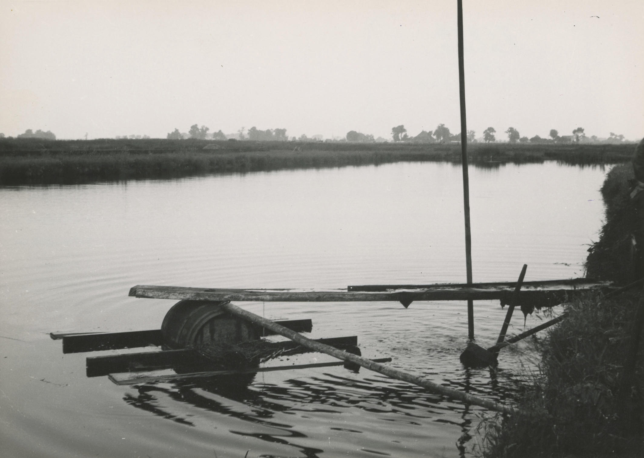 Turfwinning bij Oldemarkt. In het water drijft het zogenoemde vlot, bestaande uit een houten ton met planken aan de boven- en onderkant. Een lange boom (op de voorgrond) voorkomt dat het vlot van de wal wegdrijft. De zogenoemde trekplank rust aan de ene zijde op de ton en aan de andere zijde op de wal. ...