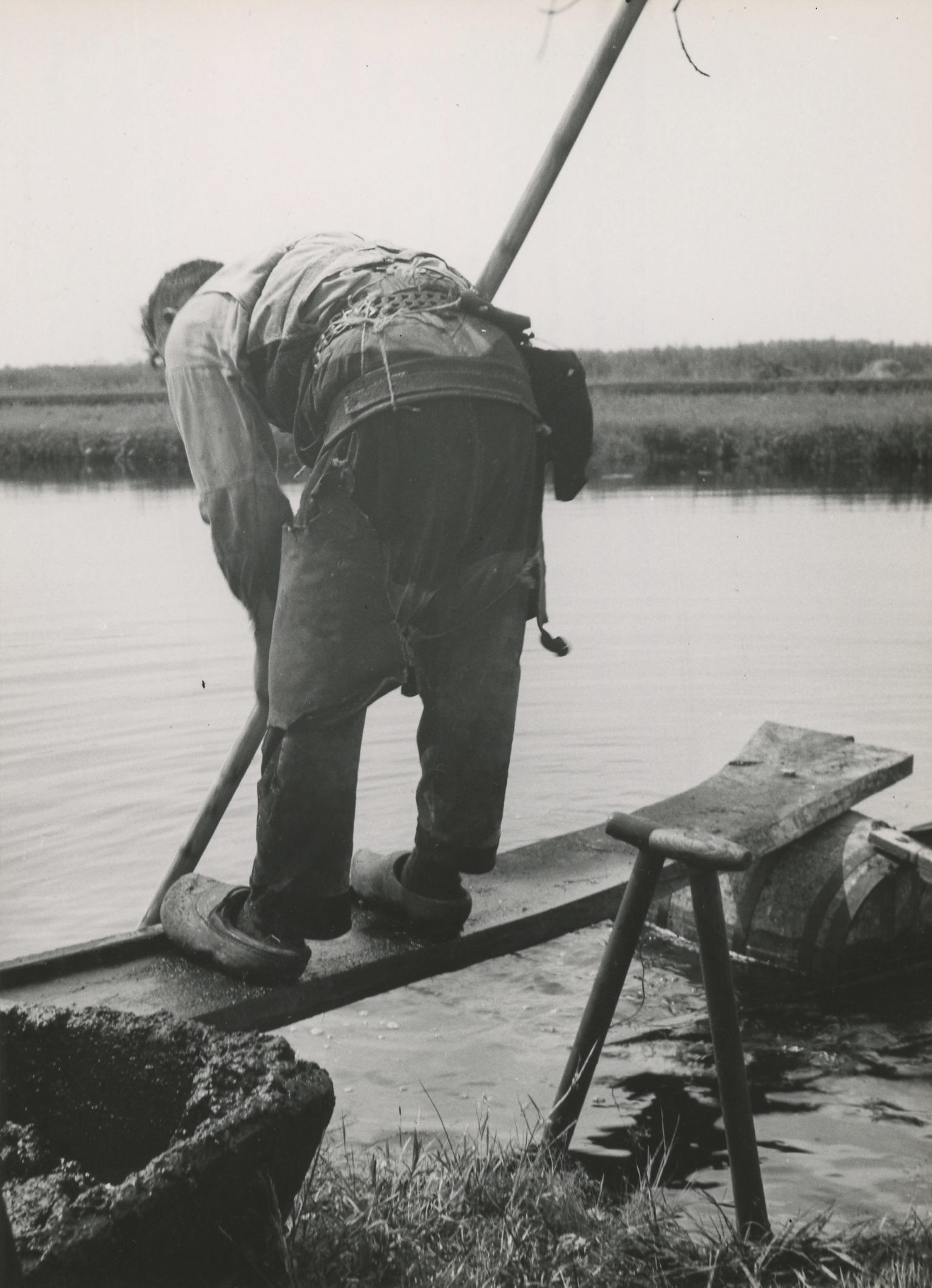 Een veentrekker aan het baggeren in het veen bij Oldemarkt. Rechts in het water drijft het zogenoemde vlot, bestaande uit een houten ton met planken aan de boven- en onderkant. De 'trekplank' rust aan de ene zijde op de ton en aan de andere zijde op de wal. De veentrekker staat tijdens het baggeren op ...