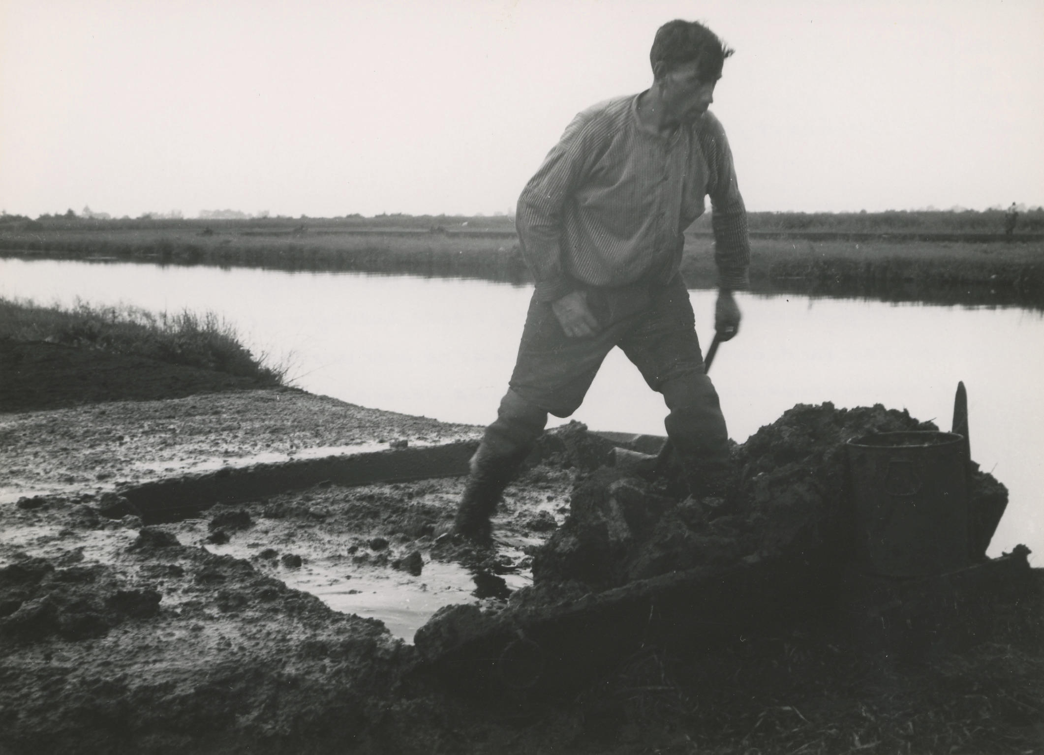 Een menger aan het werk in het veen bij Oldemarkt. De menger trapt in een houten mengbak de opgebaggerde veenkluiten fijn en mengt ze met water tot baggerspecie.